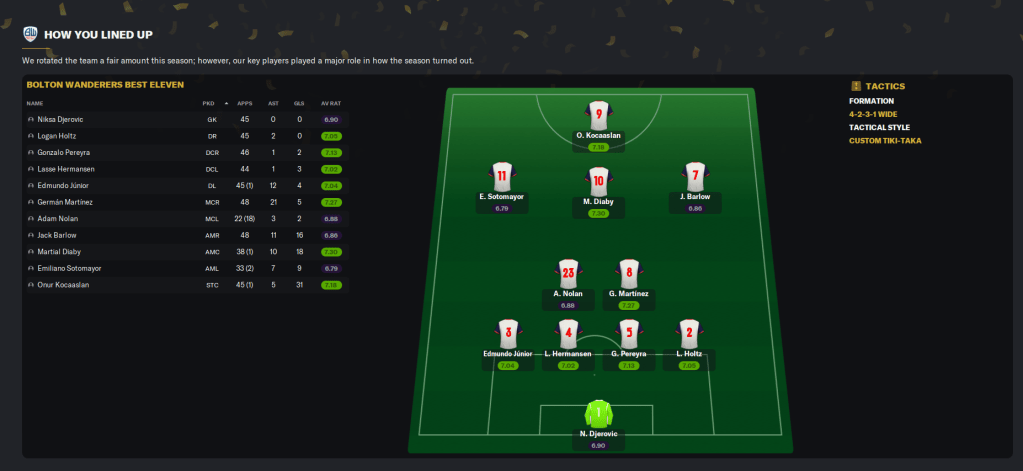 Kocaaslan top-scored again with 31 goals in all competitions, followed by Diaby (18), Barlow (16), Sotomayor (9) and Godden (7). Barlow’s eight goals in the Champions League earned him third-top scorer, well behind Topcu’s 13 in 11. Martínez topped the assists with 21 and left-back Edmundo Júnior got an impressive 12, followed by Barlow (11), Bickley and Diaby (10), Sotomayor (7) and Kocaaslan (5). However, I was concerned by the performances of the likes of Sotomayor, Godden, Johnson and January signing Andric.