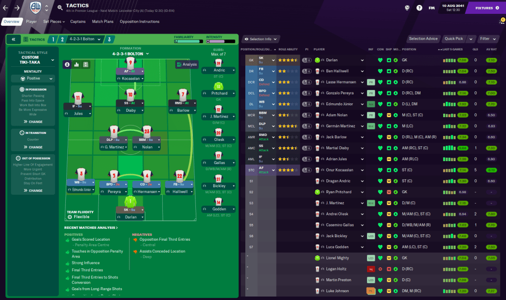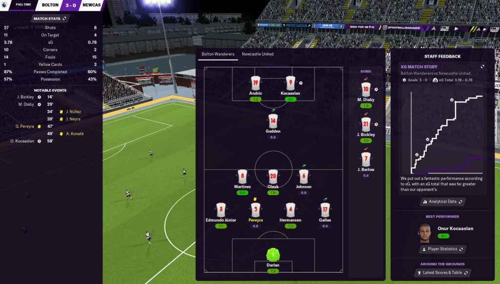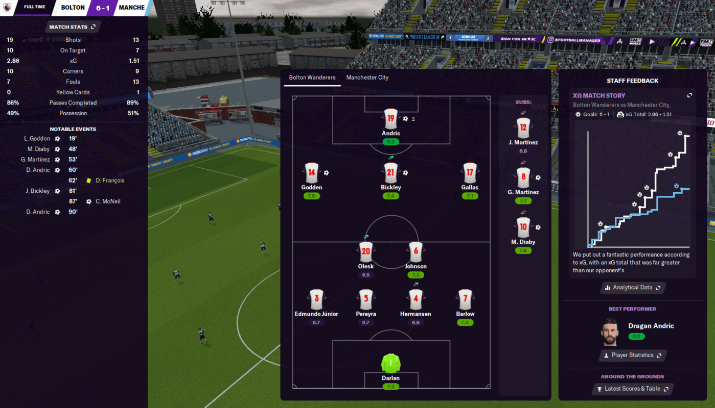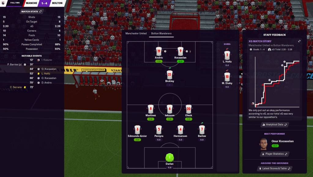 But things got a bit tougher as we went to Everton, who again seemed to be struggling, in my 1,100th match as Bolton manager. As usual at Everton they totally dominated us but we managed to sneak a very lucky 2-2 draw. Another tough game followed as we hosted Man City, who came out flying only for Godden to give us the lead completely against the run of play. Martial Diaby latched onto a long clearance to double the lead and Germán Martínez curled home a free-kick and Andric tucked home a fourth inside an hour. Two academy products combined as Jack Barlow crossed for sub Bickley before Andric doubled his tally to wrap up a magnificent 6-1 thumping.