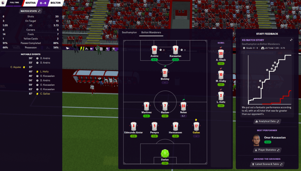 Those last two wins were coupled with nearest challengers Liverpool, who had trailed us by just two points, losing to Chelsea and rescuing a point at Burnely with an injury-time equaliser. They were our next visitors and I couldn’t understand how they were doing so well based on their horribly defensive 7-2-1 formation, which created just one shot as we dominated and Kocaaslan deservedly scored the only goal. We were even more dominant at struggling Southampton, where Andric and Kocaaslan both bagged hat-tricks and Martínez got two more assists in a 6-0 away win.
