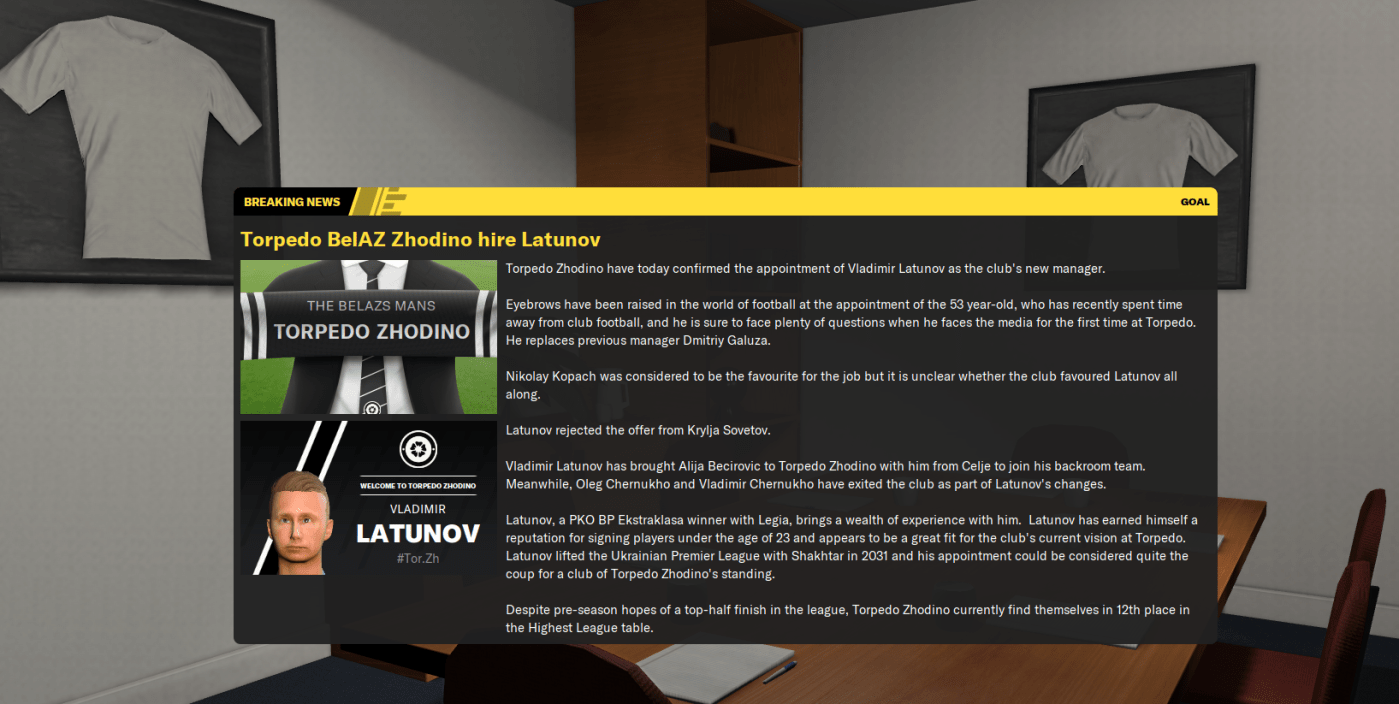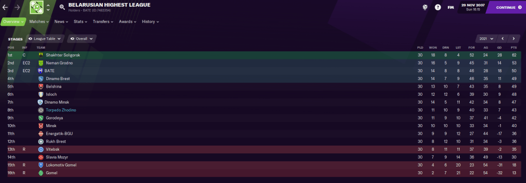 Another first for Latunov saw him join the club mid-way through the ongoing 2037 season, in which the board wants a mid-table finish. However, the club sits 14th out of 16 teams just four points off the bottom, level on points with a team in the relegation playoffs but only three points off a mid-table finish and nine behind the European places. That said, the media expects them to finish eighth.