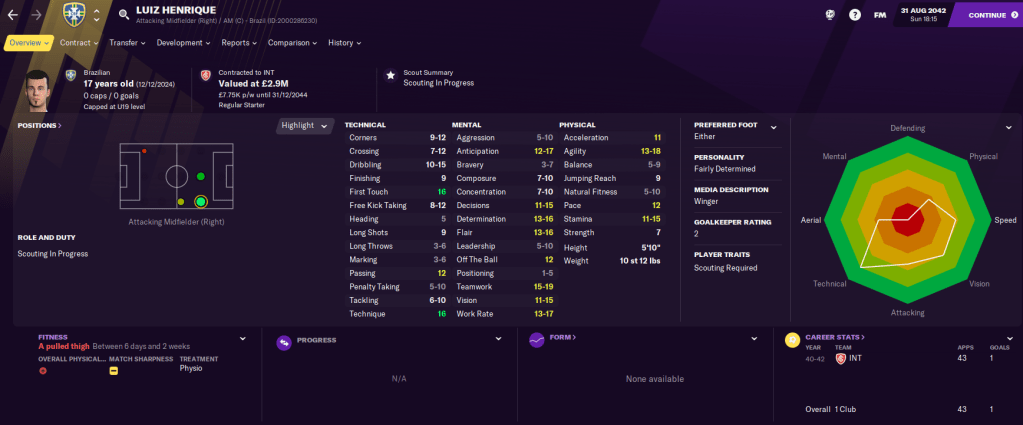 For example, I just looked at the Brazil U19 squad and the highest valued player is 17-year-old Internacional winger Luiz Henrique, who my scouts have never brought to me. Additionally, four of the top five most valuable players have no scout reports from my scouting team and there was a 16-year-old midfielder in the Under 20 squad. Additionally, i found two interesting 16-year-olds in Colombia’s U20s – so I’m not sure what my scout in Colombia is playing at. But, I’ve just requested scout reports on all of them.