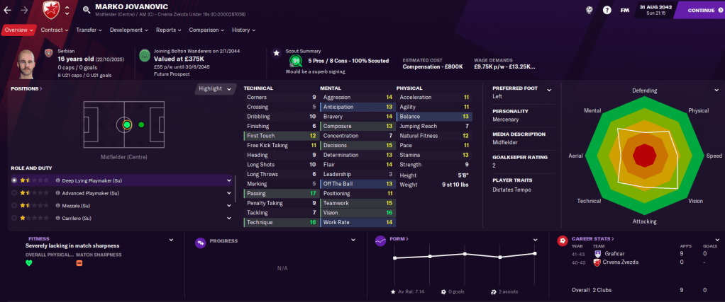 This approach is probably my biggest recommendation. I currently have 20 pre-agreed transfers for exciting players who are 17 or younger, who will sign when they become available – typically in two years’ time when they become professional. This includes players I was able to snap up on compensation deals from the likes of PSG, Real Madrid, Barcelona, RB Leipzig, AC Milan, Porto and Dortmund and the exciting looking Marko Jovanovic from Red Star – which goes to show it’s very much worth getting scout reports on ALL club youth intakes.