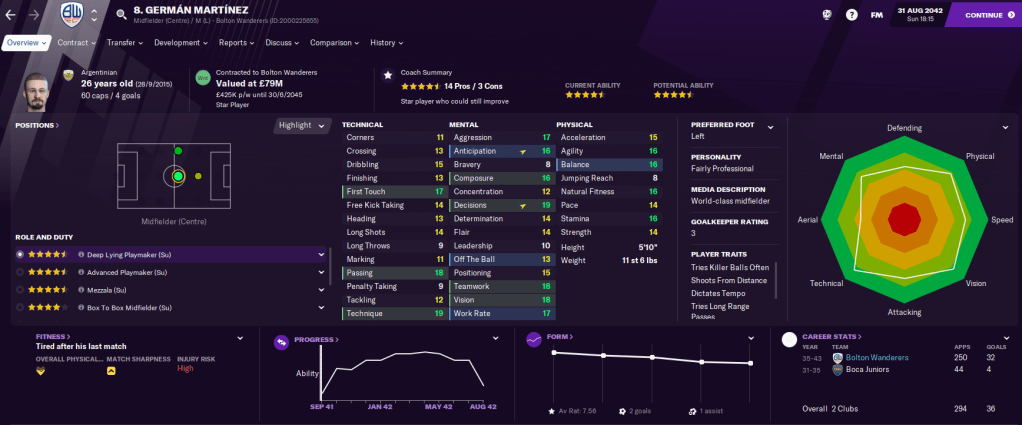 The only reason I mention this is that when I hired Harry Kane as my U18s manager in 2035, I asked him for a recommended signing and he advised a random Argentinian midfielder named Germán Martínez. He looked promising, we signed him for £6 million rising to £9.5 million – and seven years later he’s one of the best midfielders in the world and he looks like this: