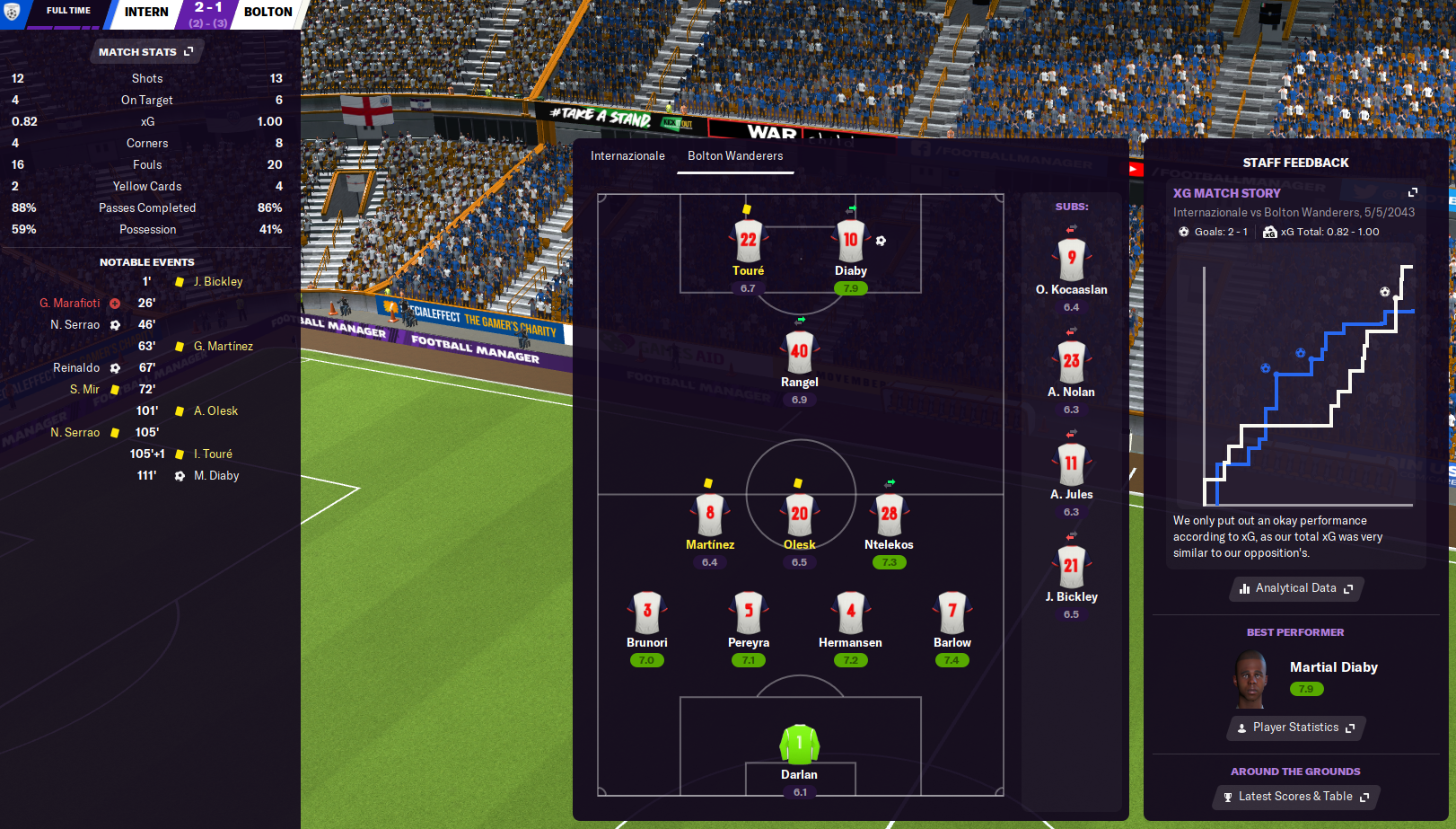 The away leg marked my 1,200th game in charge of Bolton. Inter started better and missed a great chance in a quiet second half. However, the hosts scored 30 seconds into the second half following a Darlan howler and doubled their lead 20 minutes later to take it to extra-time. I laid into the lads at full-time and it finally sparked something as Diaby, who’d been in abysmal form, raced through to chip the keeper from an excellent Ntelekos pass. We went on the defensive and held on for a narrow 3-2 aggregate win. Bolton were going to a second Champions League Final!