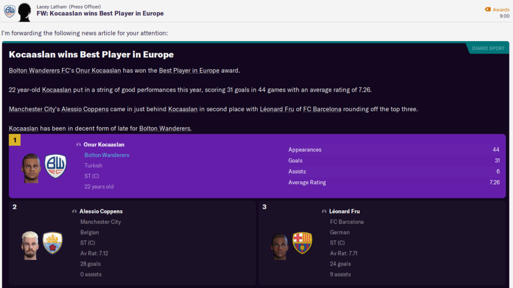 What a season this has been! The Premier League wasn’t as dominant as recent years but we certainly improved in Europe to beat Bayern, Real and Juve en route to becoming Champions of Europe. Kocaaslan led the way with 31 goals, which won him fans’ player and young player of the season. It also saw him win the Best Player in Europe award, which is the first time any Bolton player has won that award, and the European Golden Shoe. He’s now scored 165 goals in 178 games in four seasons at Bolton.