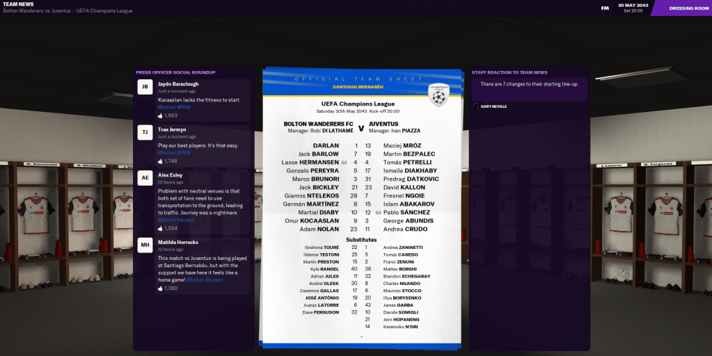 Bolton’s second Champions League Final, and first since winning it in 2040, saw them take on 2041 winners Juventus – who, hilariously, only played Edmundo Júnior in one league game and have demoted him to their Under 23s! – at Santiago Bernabeú. Juve impressively beat PSG 2-0 away to win their semi 3-2 on aggregate.