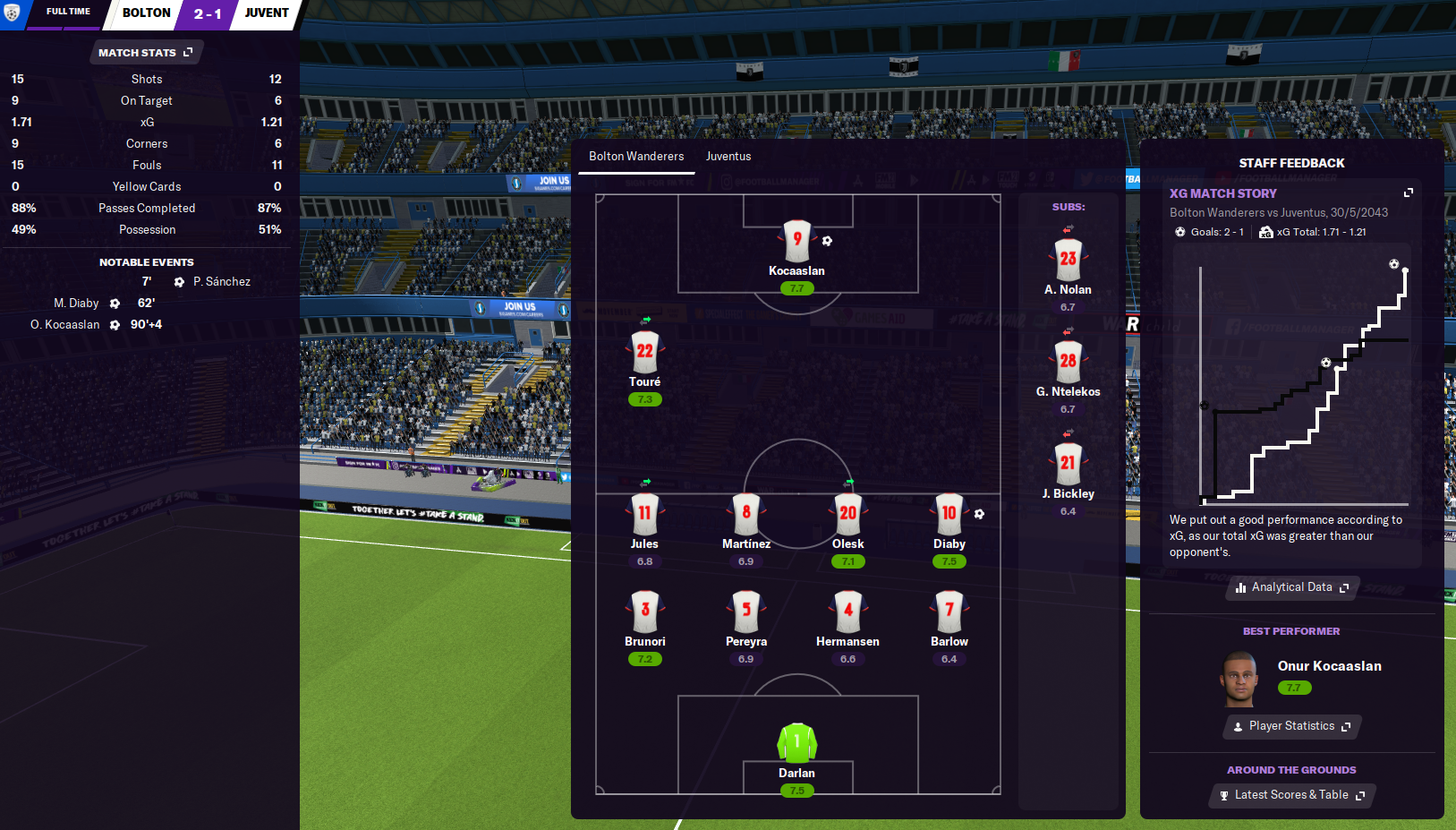 They’d also reached the Carabao Cup semis, so I entrusted them in another two-legged clash with Leicester. The home leg was up first and Jules opened the scoring on 17 minutes, which was enough for a 1-0 win. They took a battering in the away leg but a brace by loanee Andrea Lupi gained a hard-earned 3-2 defeat and a penalty shootout. Lupi then missed the third penalty only for Ryan Pritchard to save Leicester’s fourth to take it to sudden death. And our youngsters showed amazing bottle to score four successive penalties until Leicester missed their seventh. So Bolton’s youngsters were heading to Wembley!