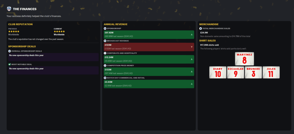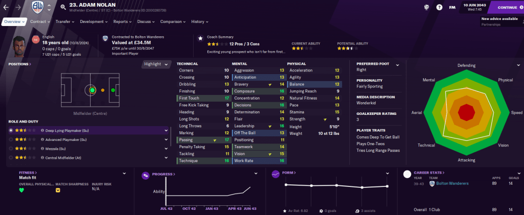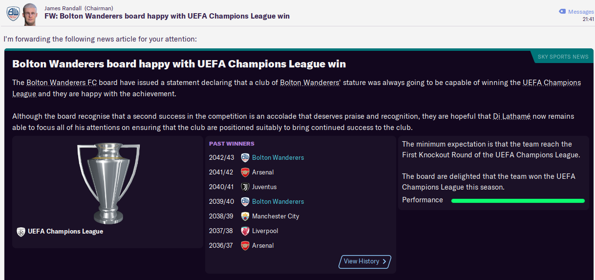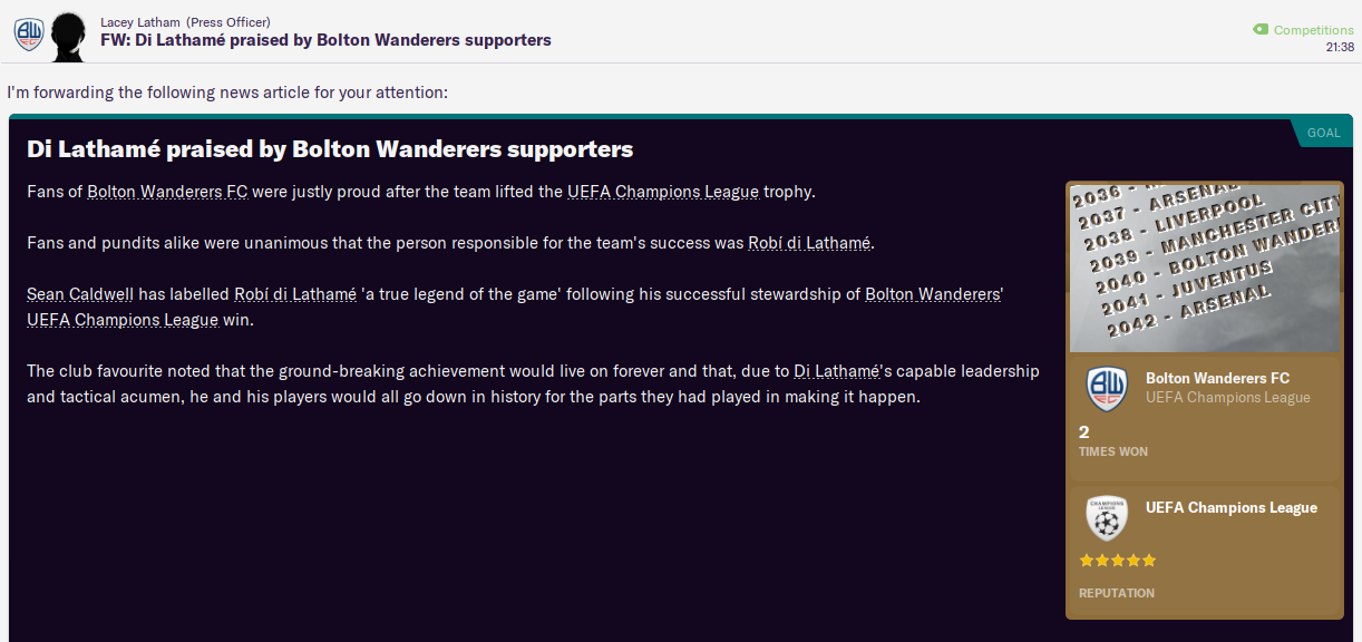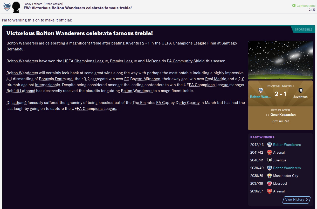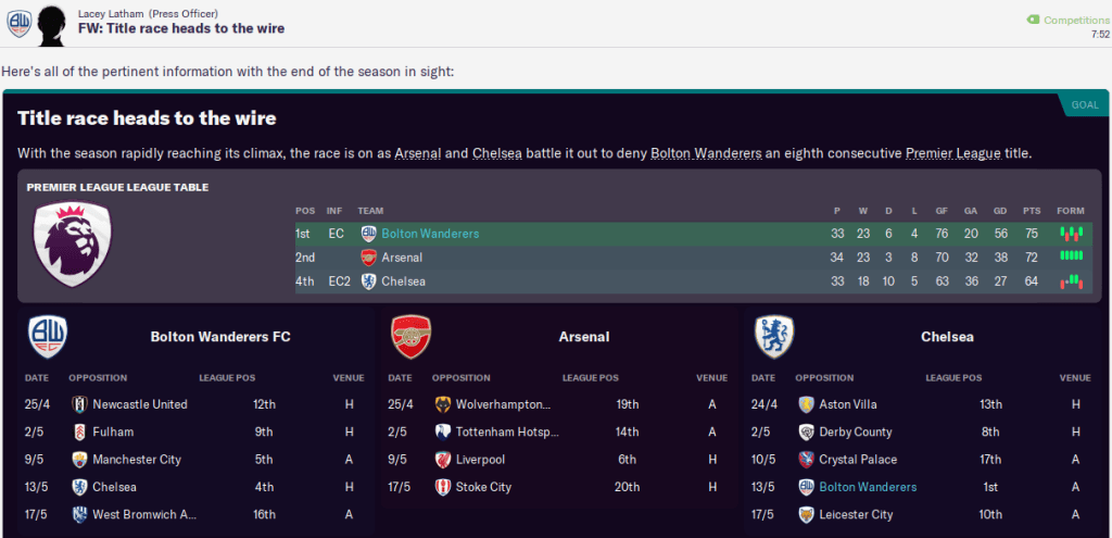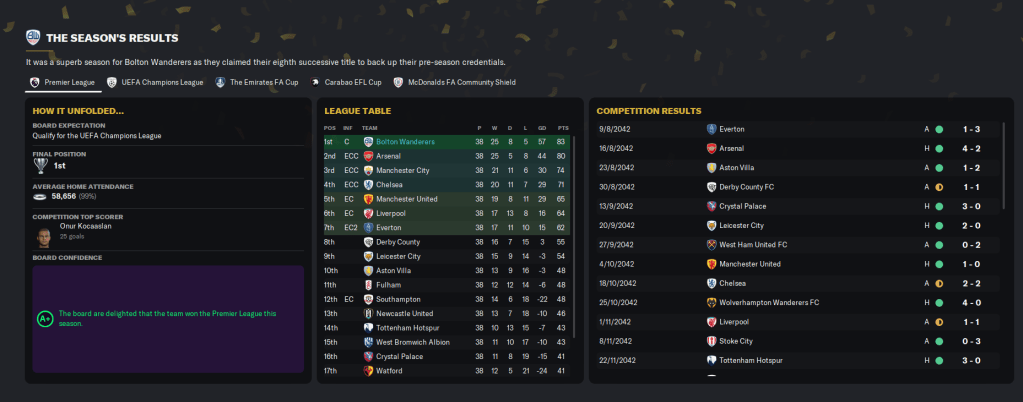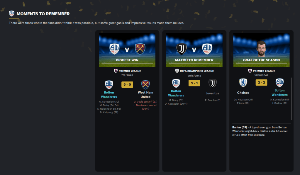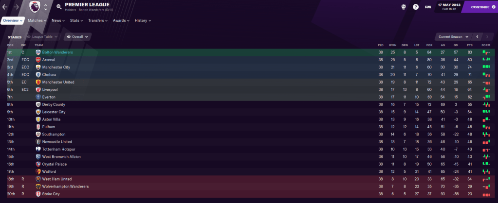 Another undefeated start to the season saw Bolton Wanderers sitting pretty at the top of the Premier League heading into 2043. Despite a few injury issues, the team was absolutely on fire as it looked to bag an 8th successive Premier League title.