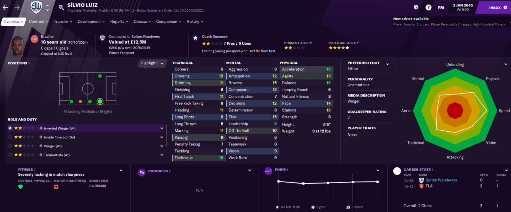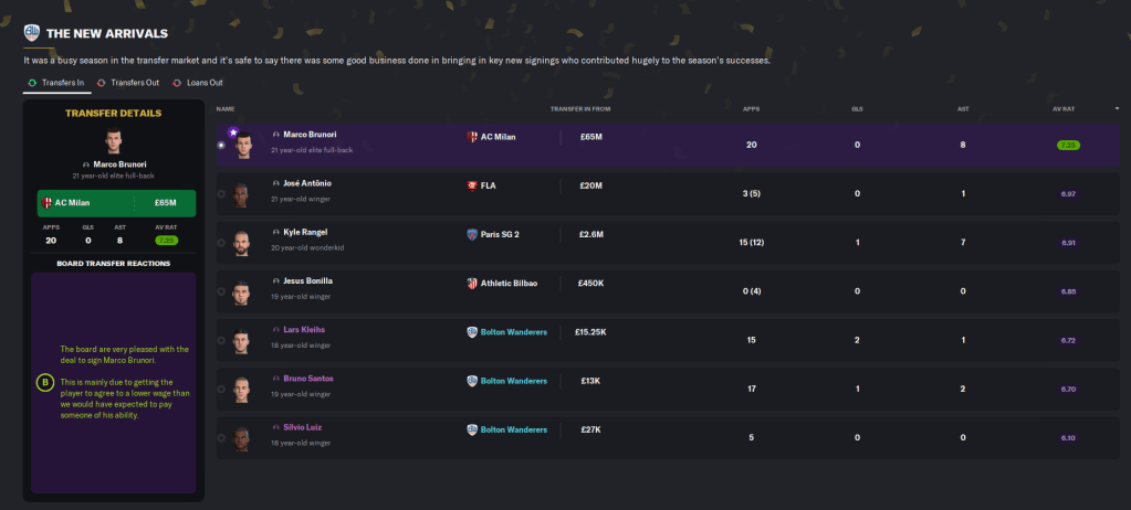 We continued our focus of snapping up youngsters from youth intakes around the world. Read my recent FM Guide article to find out how we go about doing that! And that saw the arrival of exciting American midfielder Kyle Rangel for £2.6 million from PSG, and his value immediately jumped to £26.5 million!, and Brazilian winger Sílvio Luiz for £1.9 million from Flamengo. We also tapped up Flamengo for left-winger José Antonio for £15 million, which will help us switch to our 4-2-3-1 if we need to but I’ll convert him to a shadow striker.