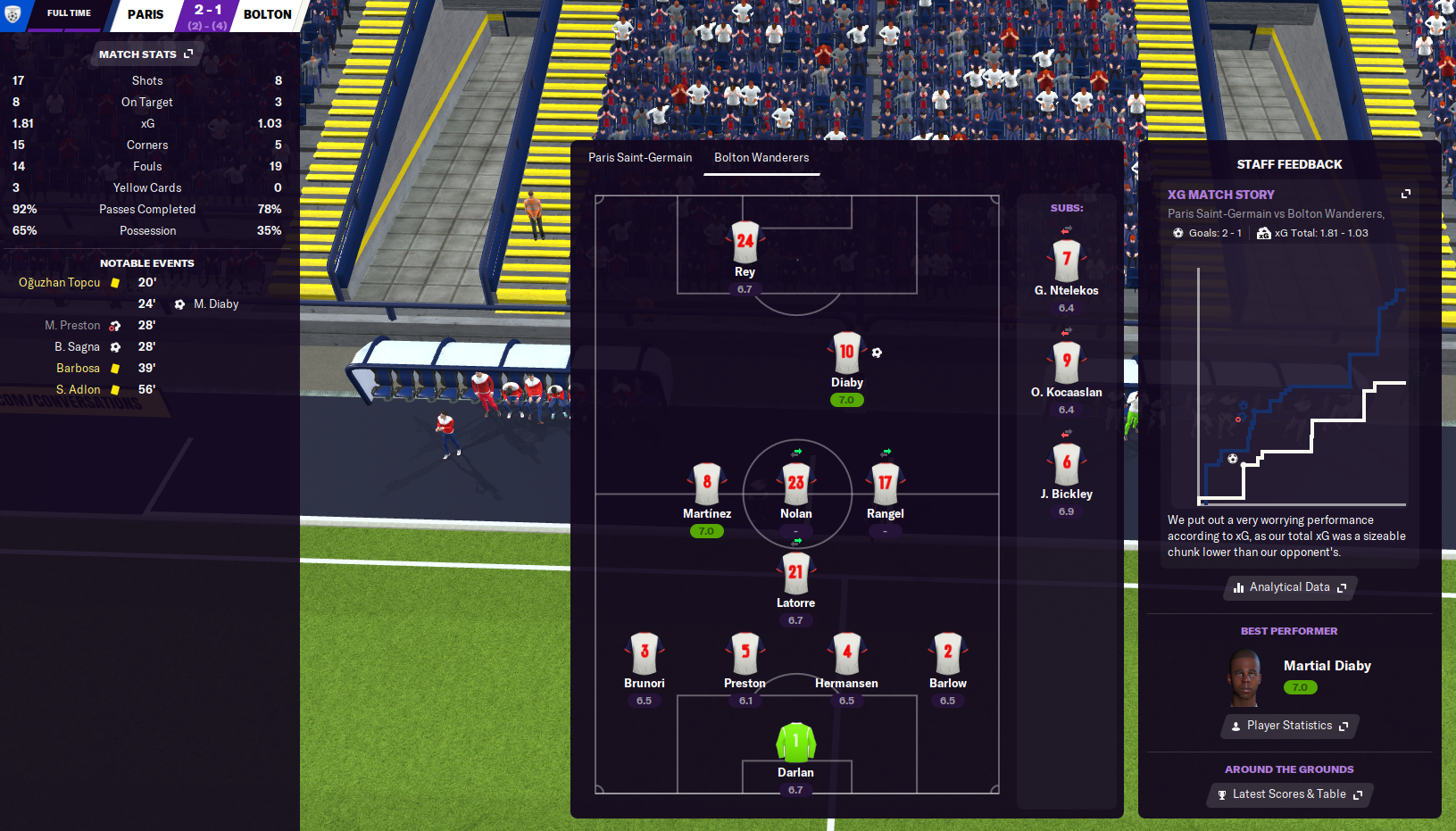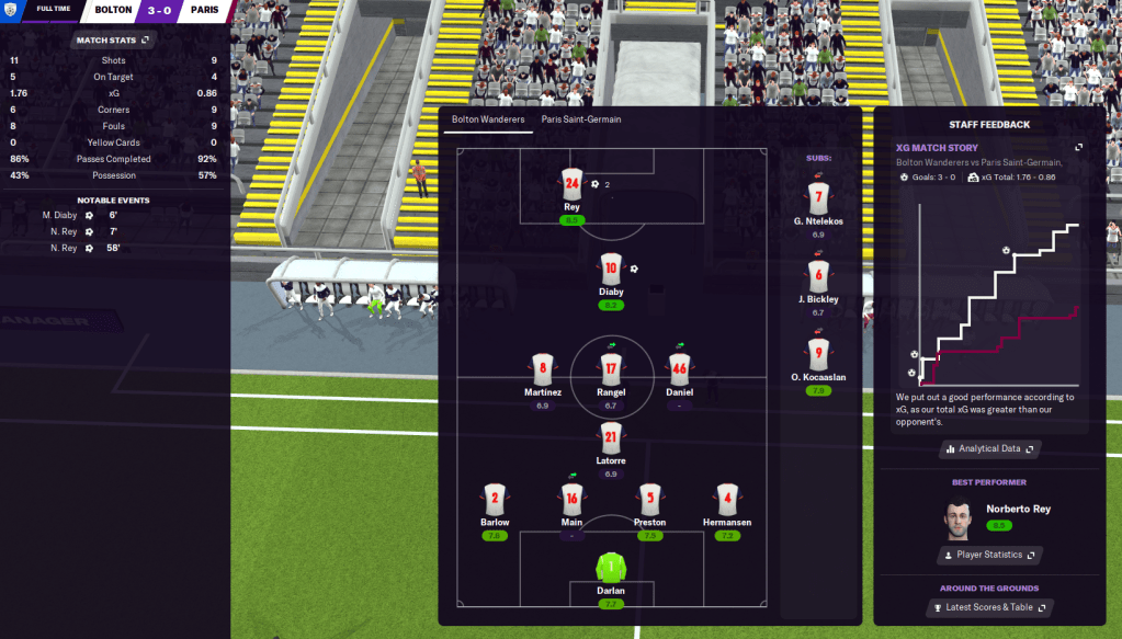 A much tougher task awaited in the semis as we took on galacticos PSG. The home leg was up first and we got an absolute flyer as Diaby and Rey scored two in a minute inside seven minutes. Rey added his second after the break and we dealt with everything PSG add to seal a 3-0 win, in what has to be one of the best results of the entire save. Diaby scored again early on in the away leg only for PSG to score twice a minute. But we went a bit more defensive and managed to nullify them from then on. And a 4-2 aggregate win sent us back to the Final for the chance to defend our European crown!