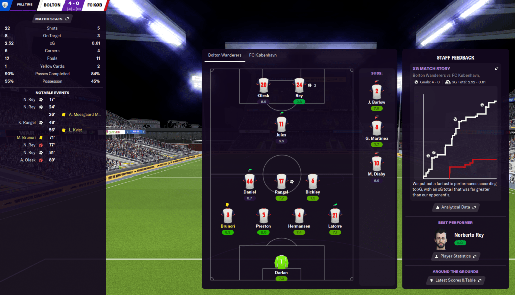 The quarter-finals saw us drawn with surprise package Kobenhavn. We went into the away leg with both centre-backs suspended and only 16 fit players, which showed in another dire 0-0. But we started the home leg much better as Rey bagged an early brace that doubled his tally for the club. Exciting American midfielder Rangel got a third before Rey wrapped up his hat-trick as we eased through to the semis.