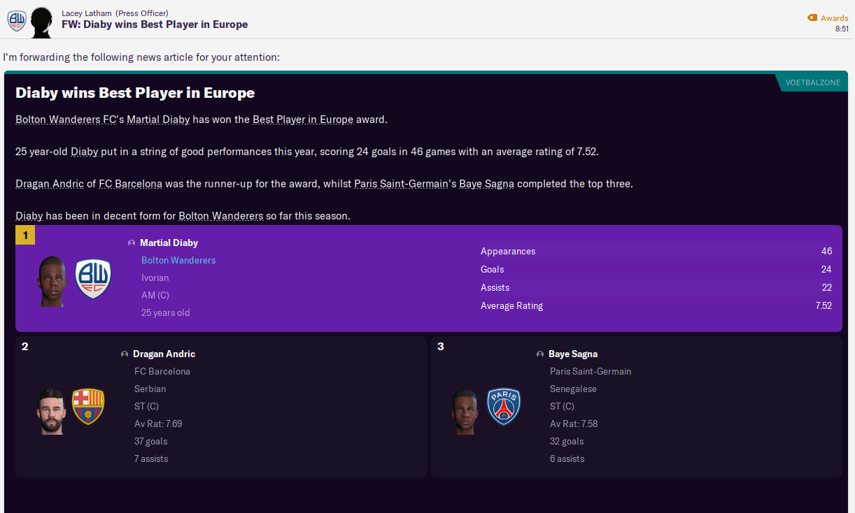 What a season as we wrapped up an amazing quintuple of Champions League, Premier League, FA Cup, European Super Cup and Charity Shield! The main man this season has undoubtedly been Diaby, who top-scored with 24 goals and got the most assists of 22 along with an average rating of 7.52 in 46 matches. On top of his domestic awards, he also won the Best Player in Europe award, which Kocaaslan won last year. He is an absolute monster of a player!
