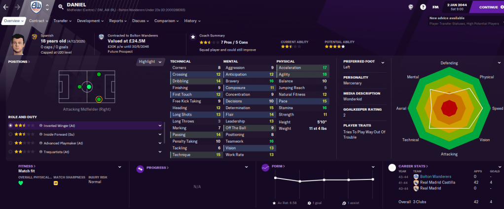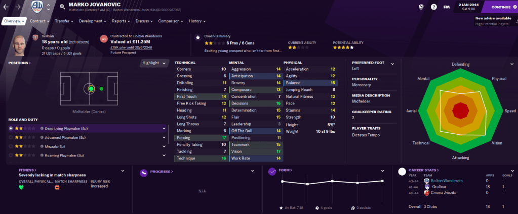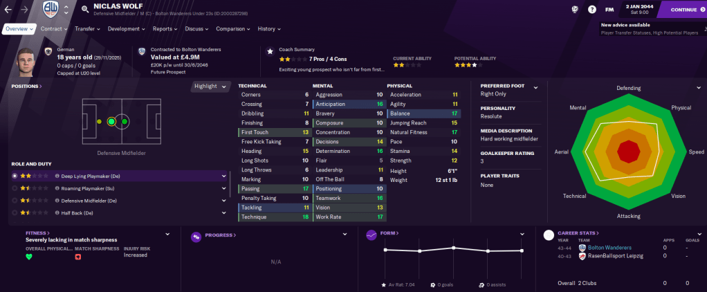 2044 began with us completing deals for eight players we nicked from youth intakes around the world. The pick of them is Real Madrid midfielder Daniel González, who cost £2.6 million, along with RB Leipzig midfielder Niclas Wolf, who cost £1 million, and Red Star midfielder Marko Jovanovic, who cost just £800,000 but doesn’t have a work permit.