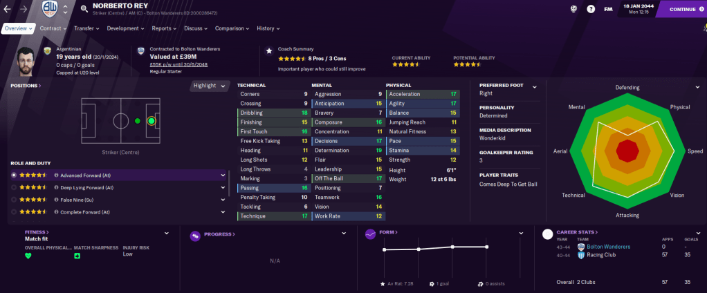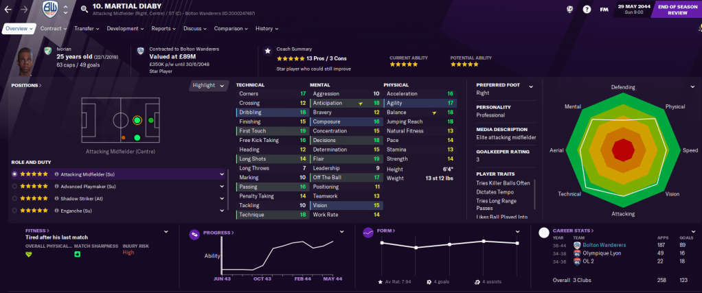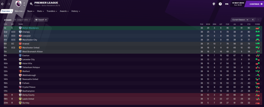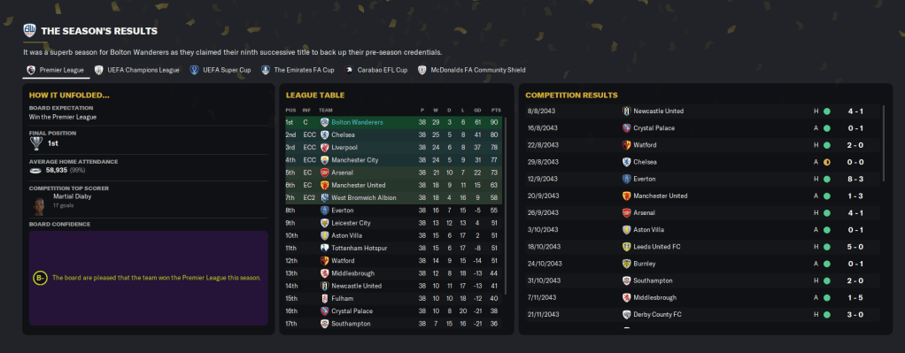 In the near 24 years this save has spanned, we’ve taken Bolton from League Two humiliation to easily the best team in England and double European champions. The dominance the club has established was starkly portrayed by our start to the 2043/44 season, which saw us win 18 and draw one of our opening 19 Premier League games.