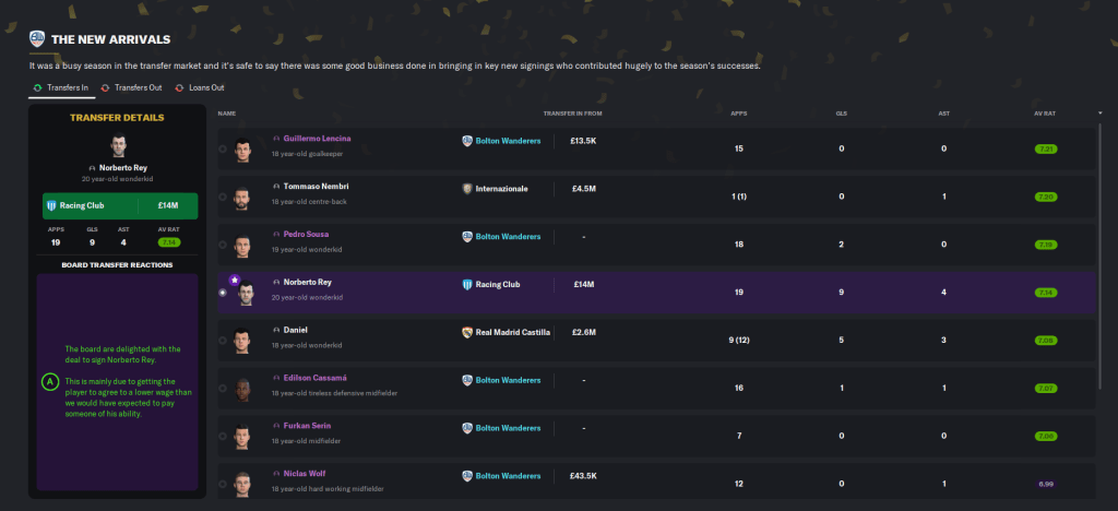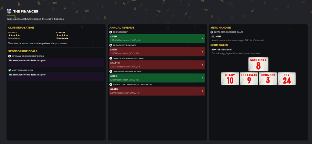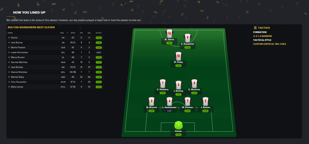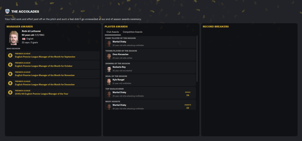 That ensured we finished the season with 90 points, 10 clear of Chelsea, and scored 95 goals, which is the third-highest tally of this entire save in the Premier League. Diaby had the highest average rating in the league of 7.51 and got the third-most assists of 14 in 32 games. That resulted in him winning the English Footballer of the Year and Players’ Player of the Year while striker Myles James, who hasn’t scored in the league since Christmas, somehow won Players’ Young Player of the Year.