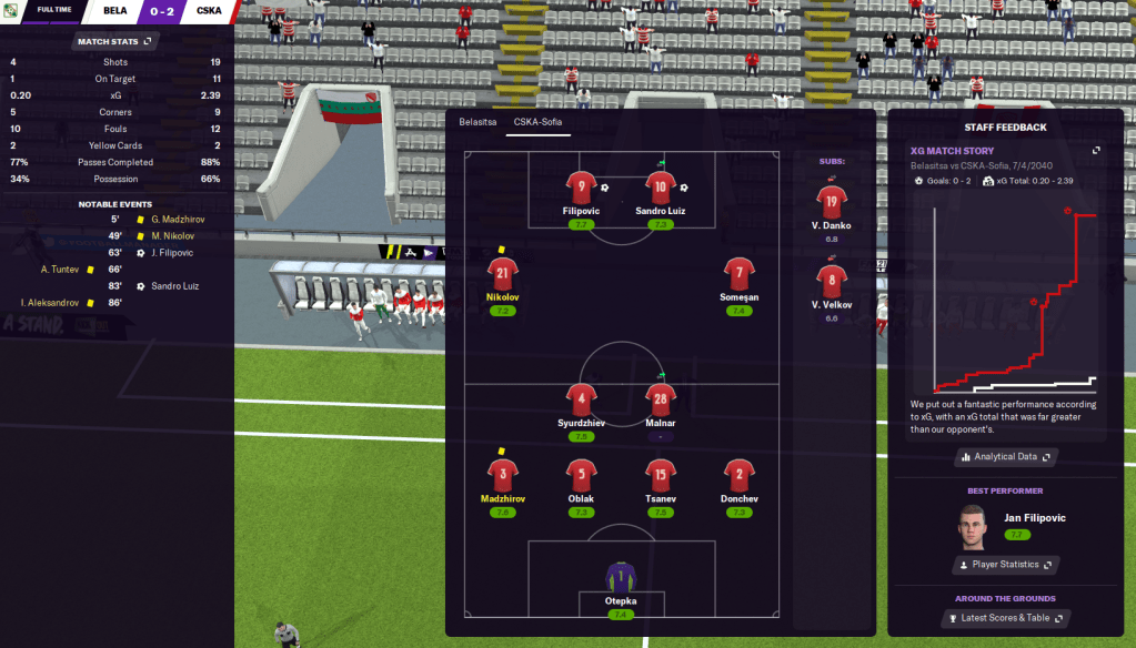 Next up was a home game with Spartak Pleven who, remarkably, after 22 games had just one point and had conceded 84! A ridiculous penalty decision – there’s no VAR in Bulgaria – saw the hosts lead with their only shot on target but CSKA fired back with a brace from winger Cosmin Somesan and another Filipovic strike. A third consecutive home game against mid-table Belasitsa saw exciting young winger Mihail Nikolov, who’s wanted by Inter and Milan, score a brilliant curling long-range shot then create a vital second for Danko to seal a 2-1 win.