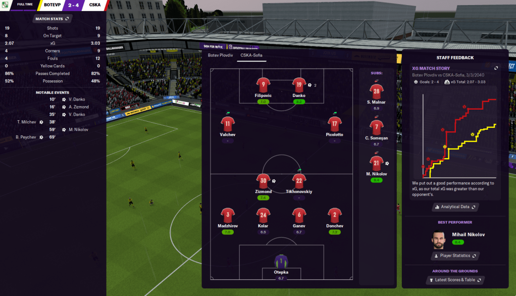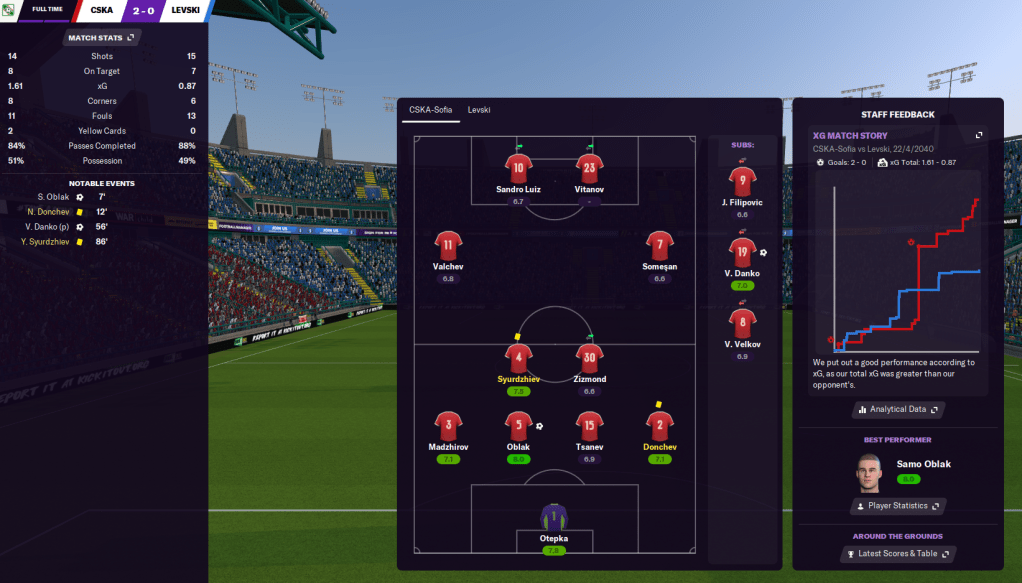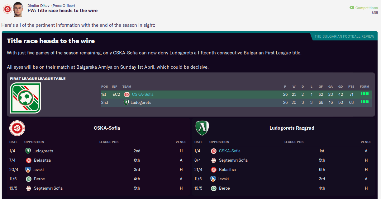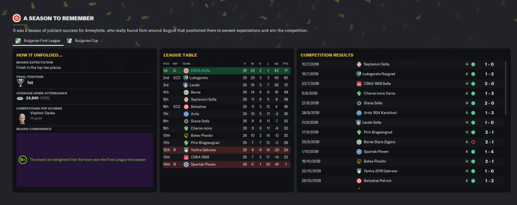 Vladimir Latunov’s 20th season as a Football Manager had seen him mount a serious title challenge with CSKA-Sofia. His second season in Bulgaria saw his side lead perennial champions Ludogorets by eight points with 12 games remaining – and having beaten their biggest rivals twice.