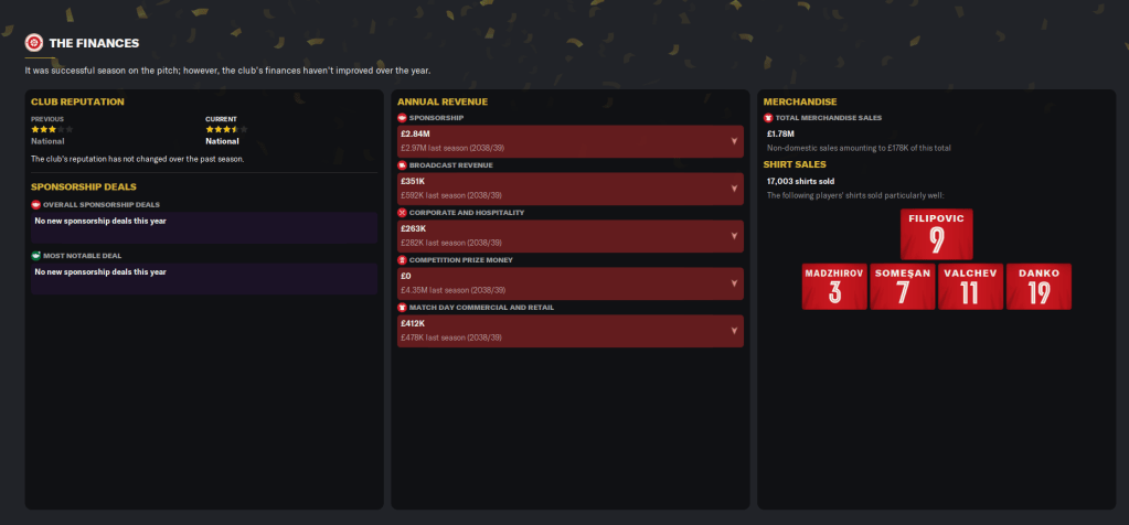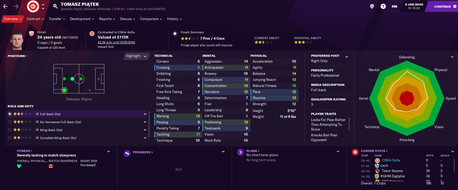 Latunov strengthened the squad by signing left-winger Jaílson Picolotto, who was required as first choice Ivo Valchev picked up seven injuries that saw him miss six months of 2039, for £650,000. He also added backup right-back and midfielder Tomasz Piatek for £110,000, and backup centre-back Petr Kolar for £500,000. But they ended the window with £8 million remaining in the transfer kitty!