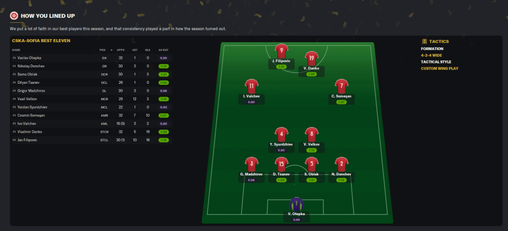 The key players behind CSKA’s success were the strikeforce of Danko, who top-scored with 19 goals and six assists, and Filipovic, who scored 16 and got 10 assists. Somesan chipped in with 10 goals and seven assists while Velkov topped the assists chart with 12. Oblak was also excellent with an average rating of 7.21, only bettered by Danko’s 7.26.