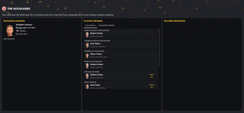 Bizarrely, the season ended under a transfer embargo became the focus of a takeover. Sandro Luiz, who just turned 35, capped his magnificent career in style with a goal in a 3-1 loss at Beroe before Nikolov and Filipovic sealed a final day 2-0 win over Septemvri. Sandro Luiz finished his career with 212 goals in 619 league games, of which he scored 85 in 108 under Latunov. What a hero.