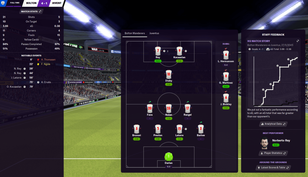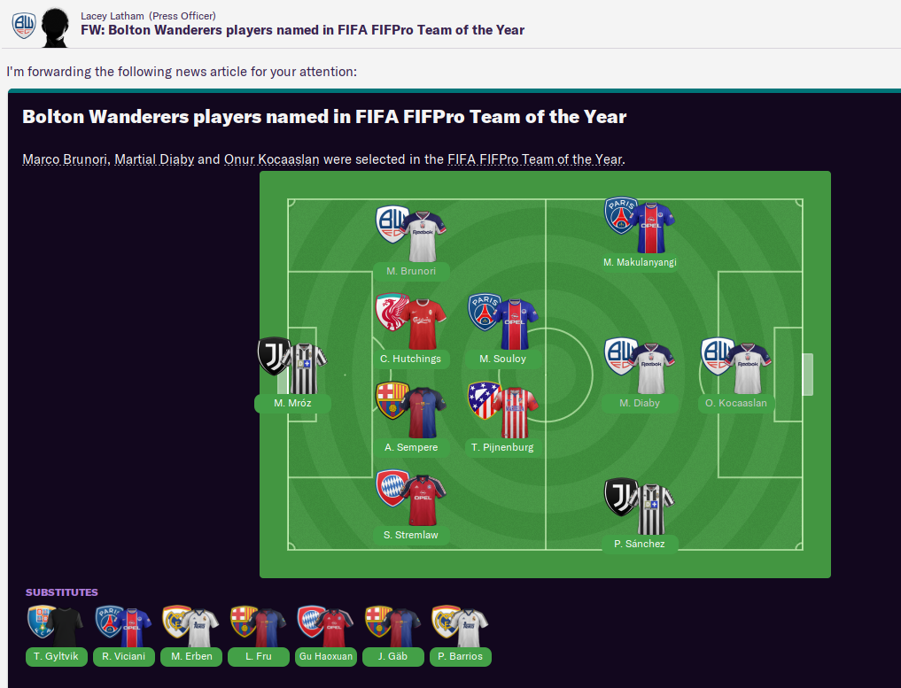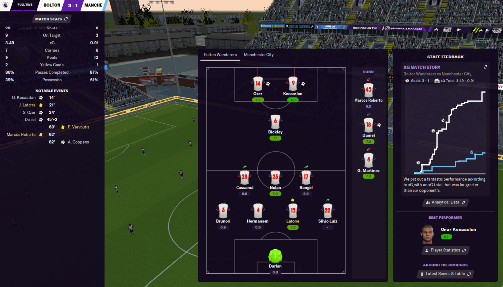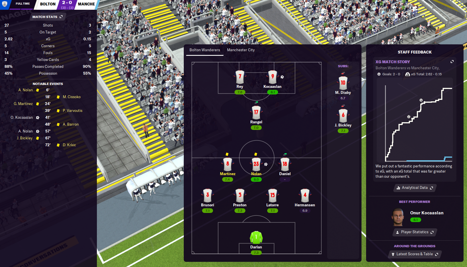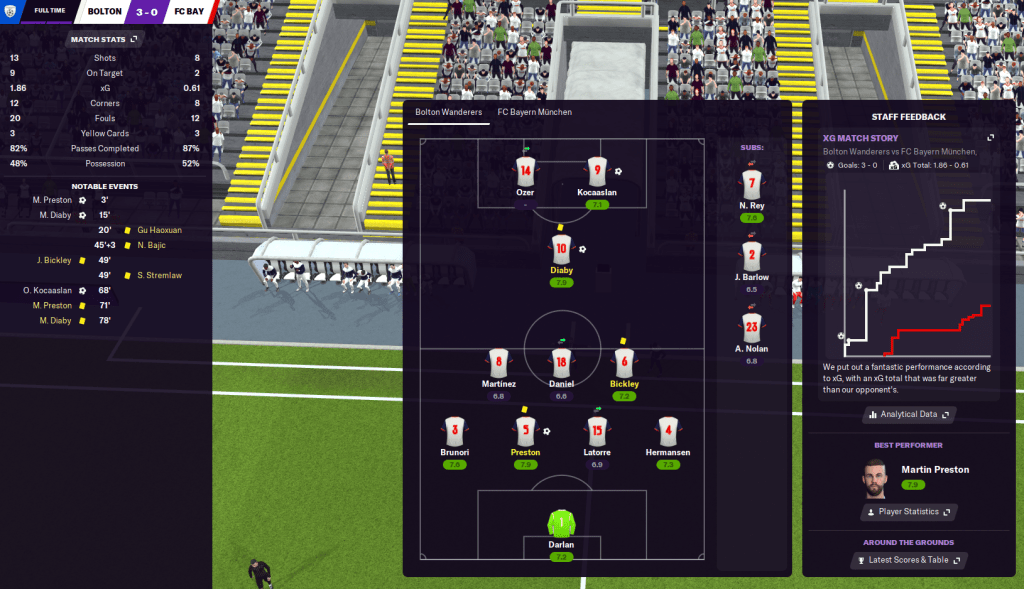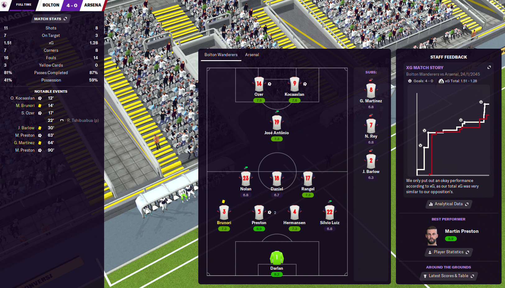 We had the better of a trip to Chelsea end eventually nicked it through a second half strike from legendary midfielder Germán Martínez. We hosted Arsenal in my 1,300th match as Bolton manager and made a flying start with goals from the strikeforce of Kocaaslan and Ozer then homegrown centre-back Martin Preston headed home twice from corners after the break!