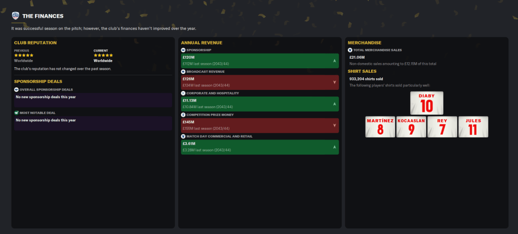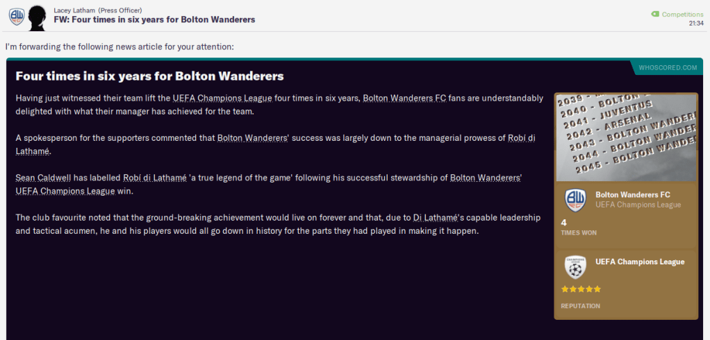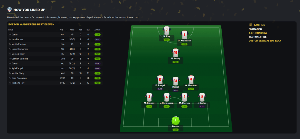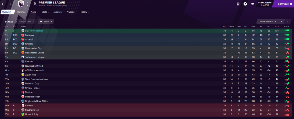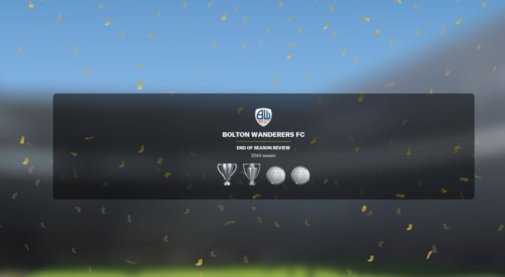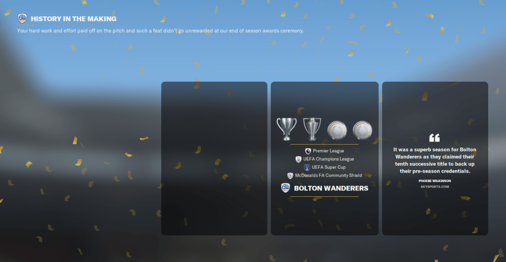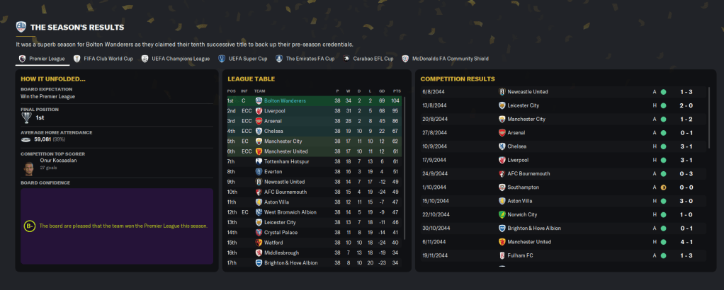 This was our best season so far in the league, racking up Premier League records for most points, most wins and most clean sheets. And the league and European treble makes this Bolton side easily the best I’ve ever had on Football Manager, probably now surpassing my Atalanta team on FM19.