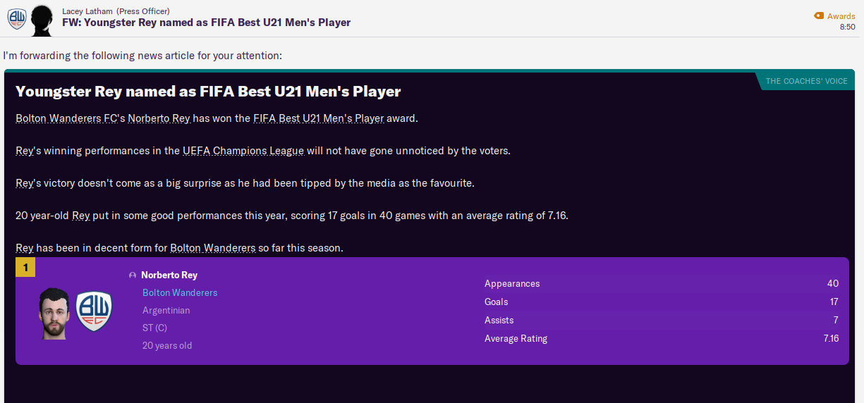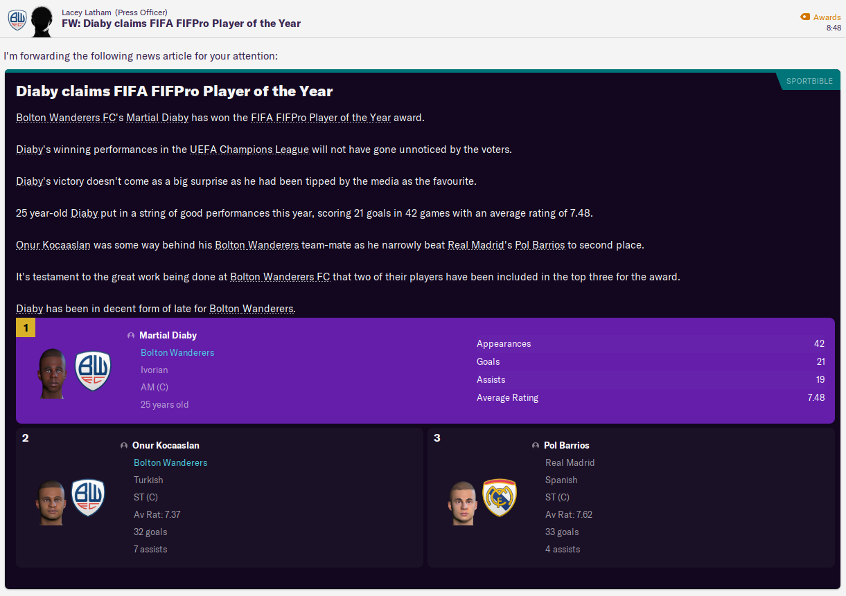 2045 began in perfect fashion as attacking midfielder Martial Diaby became the first Bolton player ever to be recognised as the best in the world as he won the Ballon d’Or, FIFA Best Men’s Player and FIFA FIFPro Player of the Year awards. Diaby has been sensational in the last 18 months or so and in the previous calendar year scored 21 goals and got 19 assists.