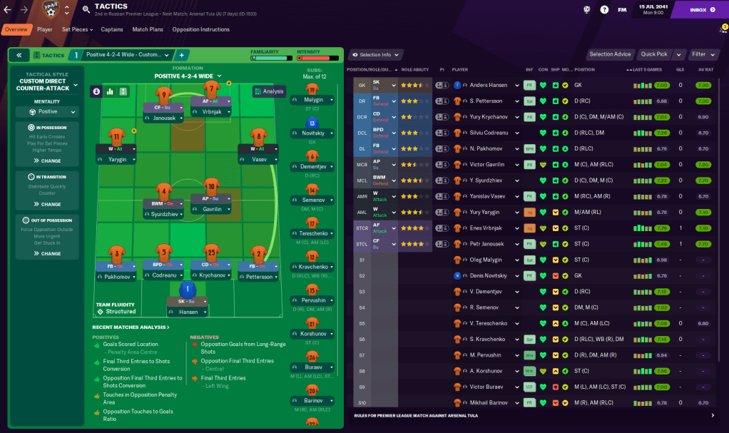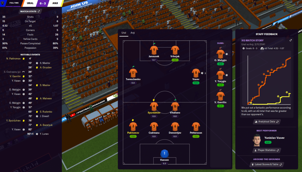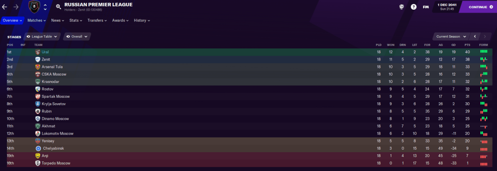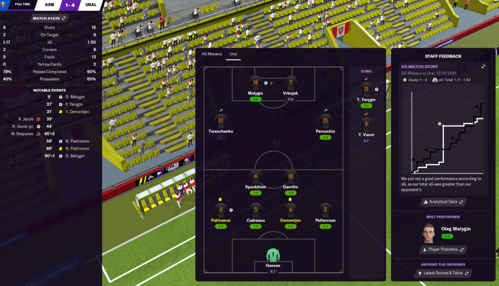 The 2041/42 campaign began away to Lokomotiv Moscow and Ural came out flying with 12 shots to the hosts’ one in the first half without converting. But the strikeforce of Petr Janousek and Vrbnjak bagged goals in the first ten minutes after the break to seal a deserved 2-0 win.