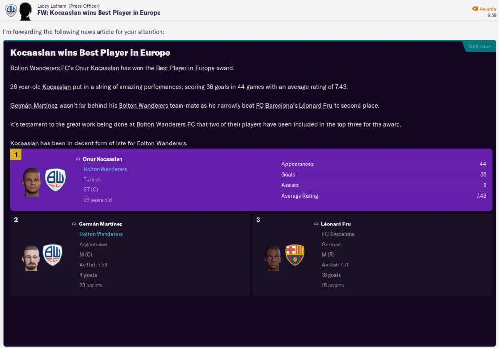 Kocaaslan scored 36 goals in 44 games, including a goal and assist in Champions League Final injury-time. He’s now the all-time leading Bolton goalscorer with 287 goals in all competitions, and trails Lofthouse’s record of 255 league goals by 35. The man is an absolute monster of a player. And the European voters sided with him, awarding the Turk the honour of Best Player in Europe with Martínez in second.