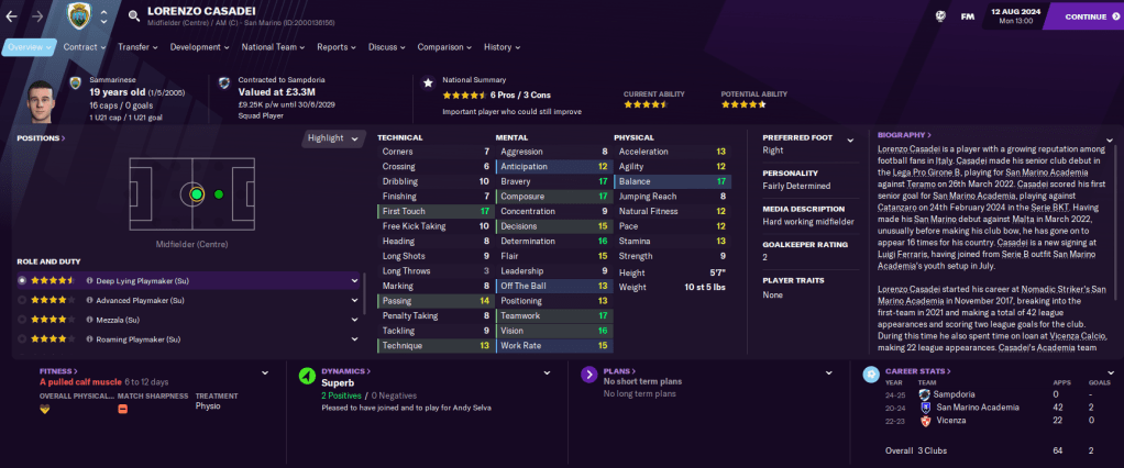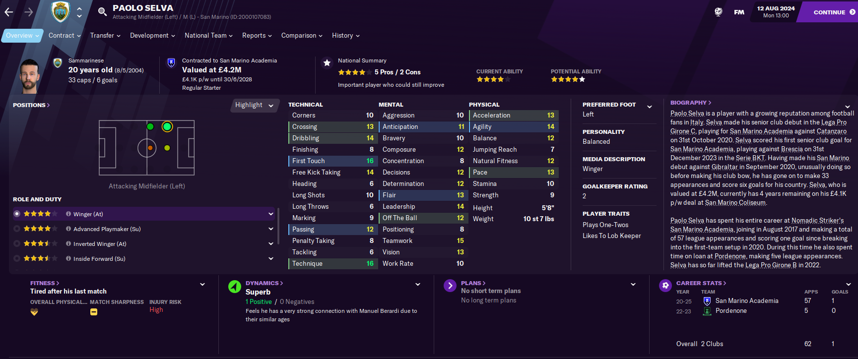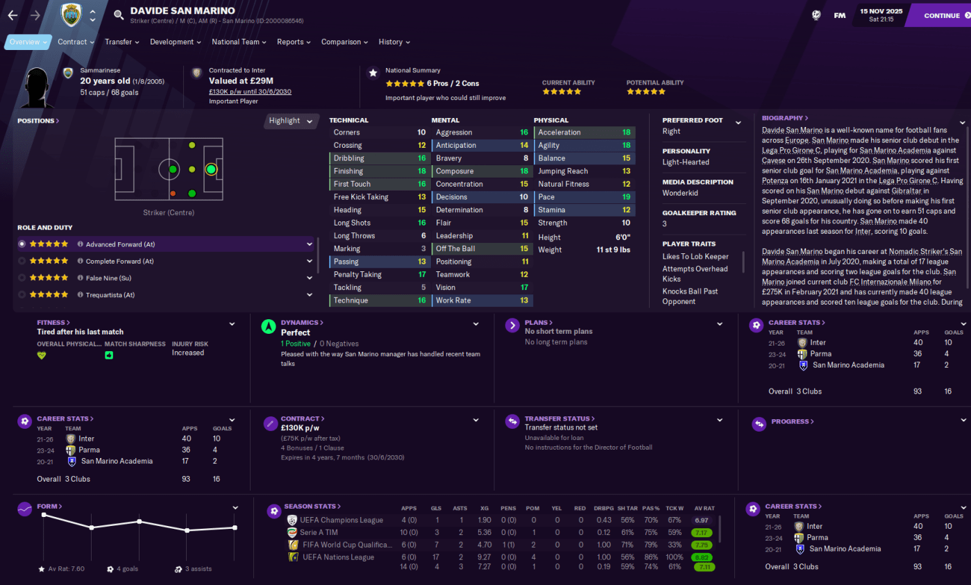 A long period without games saw several of San Marino’s young starlets progress very nicely. The pick of those was midfielder Lorenzo Casadei, who sealed a £6 million move to Sampdoria over the summer, and left-winger Paulo Selva, who’s now worth £4.2 million. But, of course, the star man DSM has continued to flourish after a season on loan at Parma, who oddly played him in centre midfield!