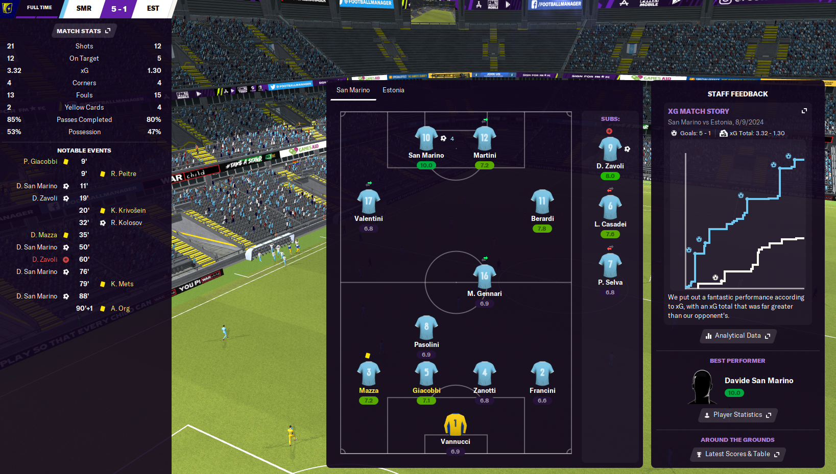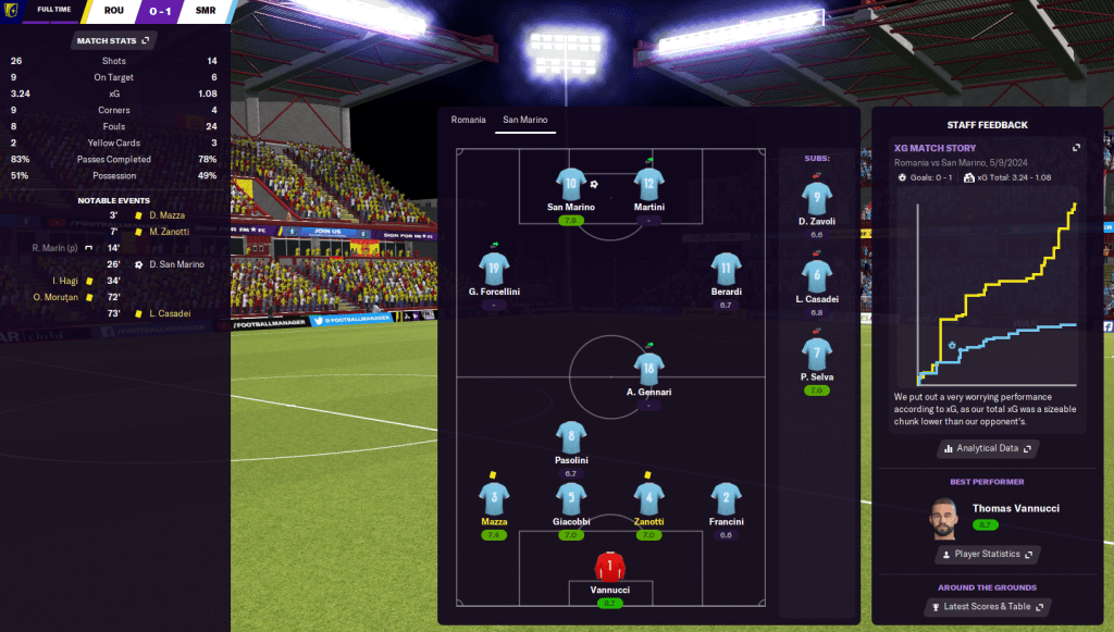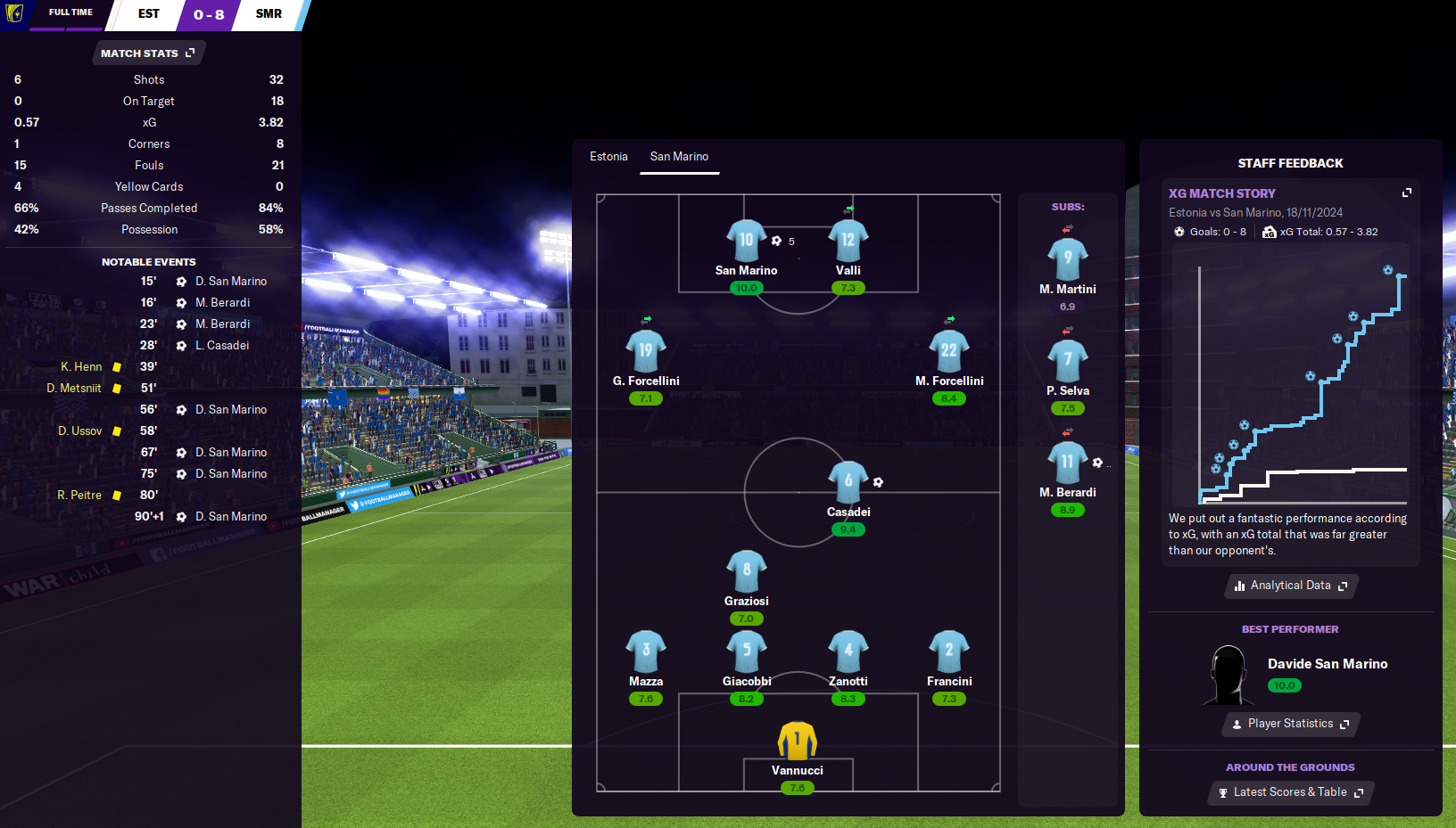 The campaign began with the toughest test of the group, away to Romania. But San Marino worked absolute wonders to win 1-0. DSM scored after 26 minutes then Thomas Vannucci was an absolute brick wall in goal, keeping Romania out despite their 3.24 xG and making a ridiculous 18 saves to earn an 8.70 rating.