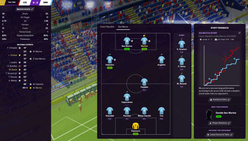 It began with DSM missing a first match for San Marino in five years as he got injured playing against Real Madrid for Inter. First up was the Czechs at home, and San Marino got a flyer through an absolute rocket by midfielder Mattia Capicchioni. But the Czechs came back to win 2-1 with a late winner by Patrick Schick.