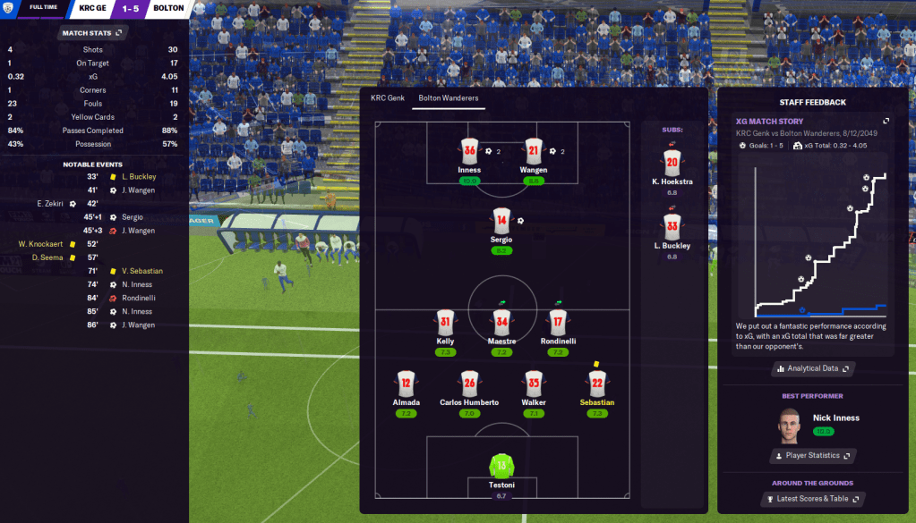 We drew Inter in the group stage for the second year in a row, along with Genk and Valladolid. We got off to a flyer in Milan as a Martínez masterclass inspired a 3-0 win over Inter. Then fully rotated, very young sides battered Genk with 28 shots to two and won 2-0, including a goal from Wangen, beat Real Valladolid 1-0 home and away and beat Inter 3-0 with Wangen scoring again. They rounded the group off with one of the best individual performances of the save as homegrown striker Nick Inness scored two and created three and Wangen scored two more in a 5-1 thrashing of Genk!