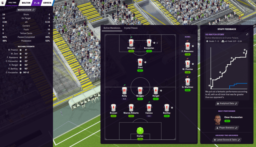 Our romp towards the title continued with a new Premier League record 20-match winning spree, which included 11 consecutive wins without conceding. Highlights were a 7-0 battering of Palace, Kocaaslan scoring the only goal at Newcastle in my 1,600th match in management, and hot prospects combining as Wangen teed up Kelly for the opener at Bournemouth.