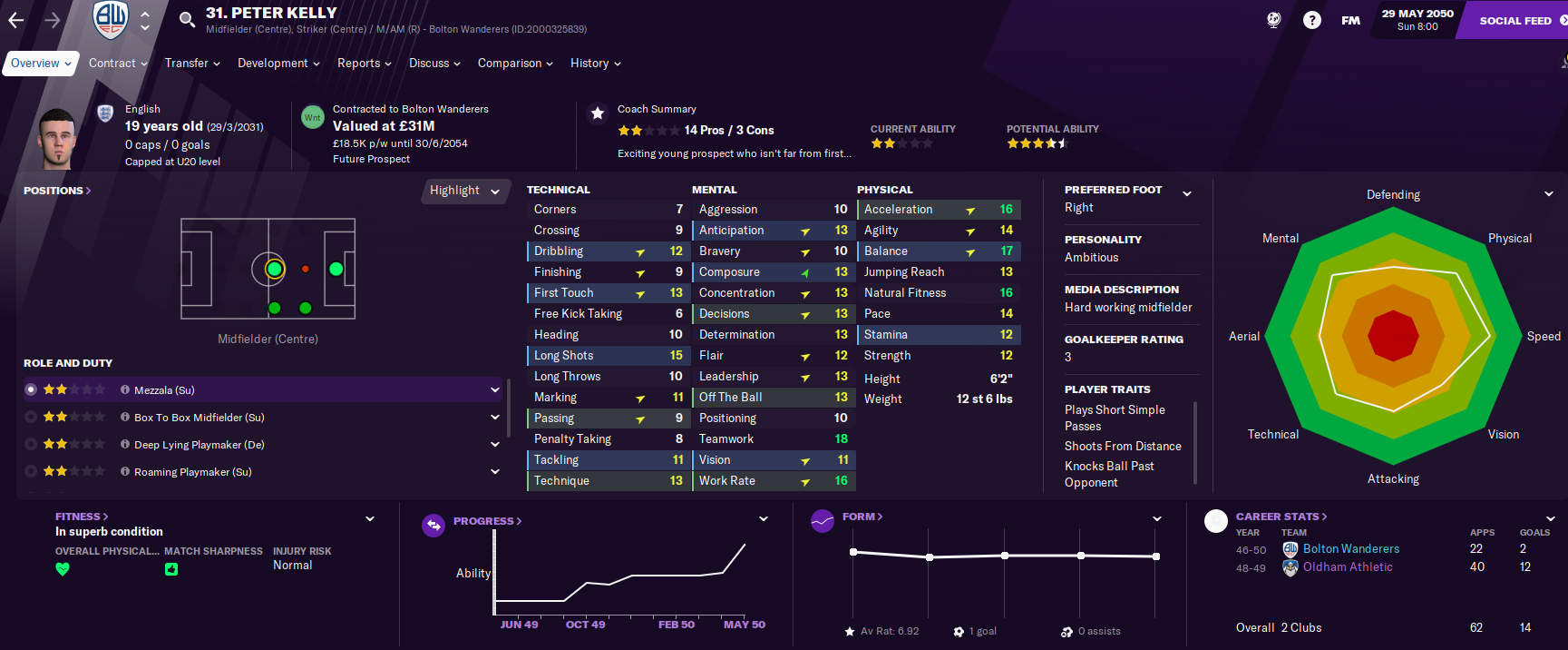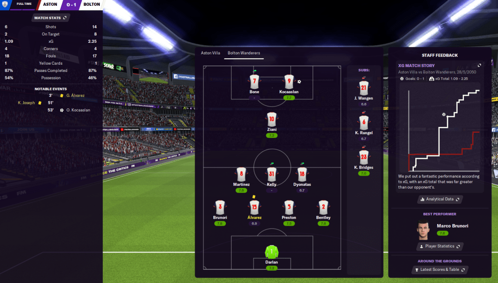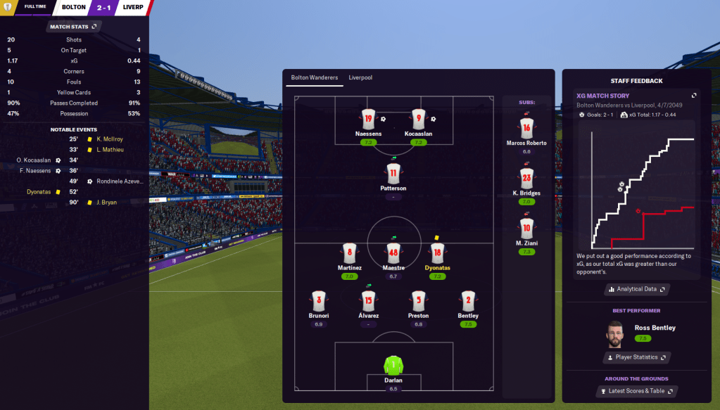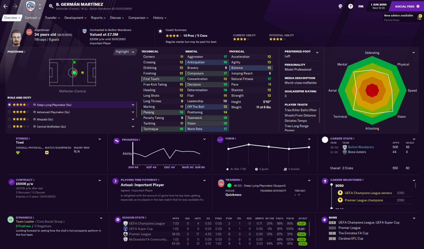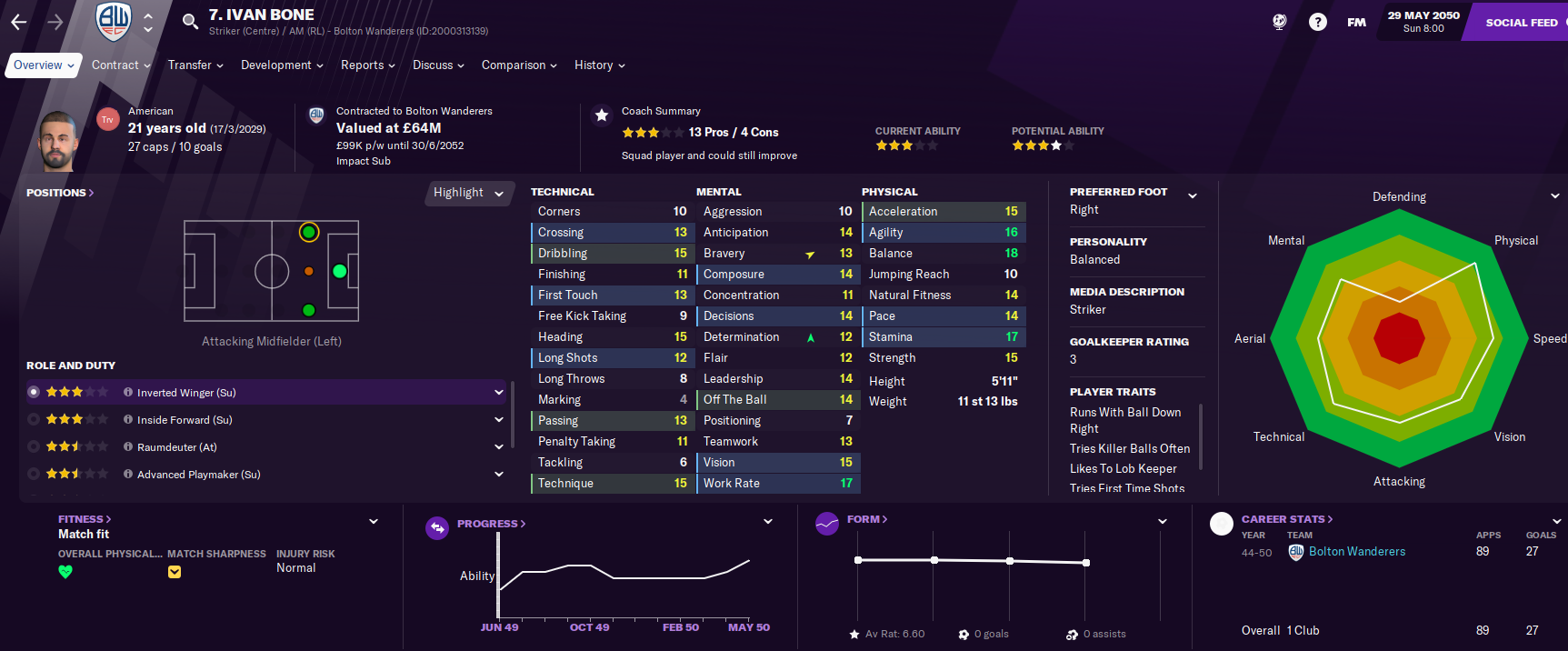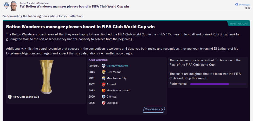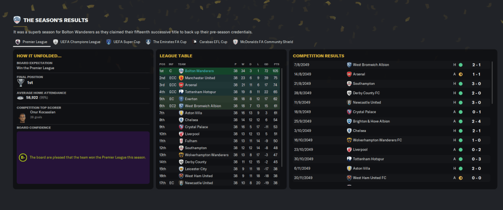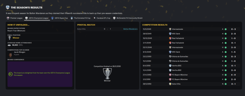 Bolton Wanderers had bagged yet another Premier League title and a 6th Champions League in 10 years in the 2048/49 campaign. With 2050 (and FM22) approaching, I’d decided this would be my last season, which also happened to be the 175th in the club’s history. And we went into it targeting a first Club World Cup and 15 titles in a row.