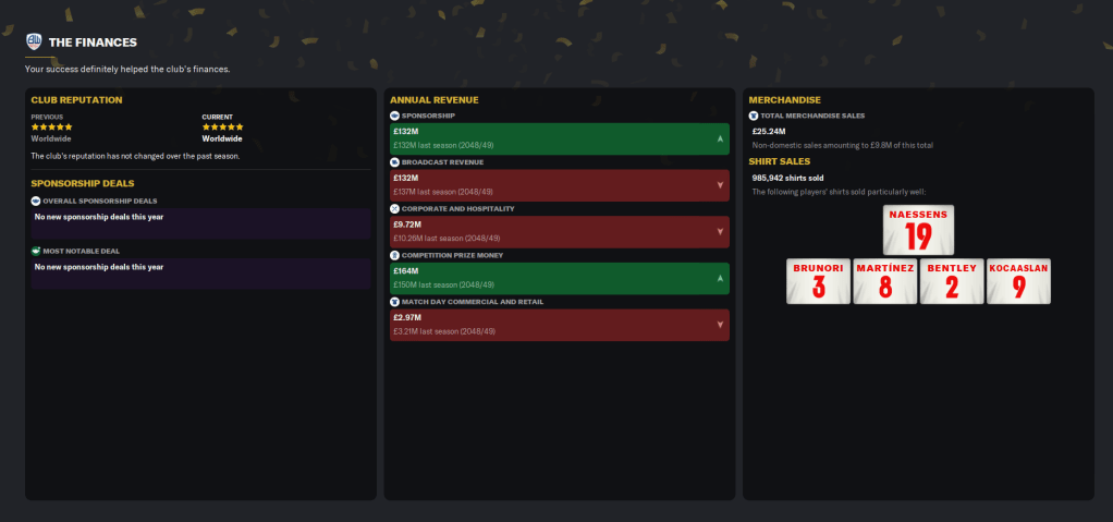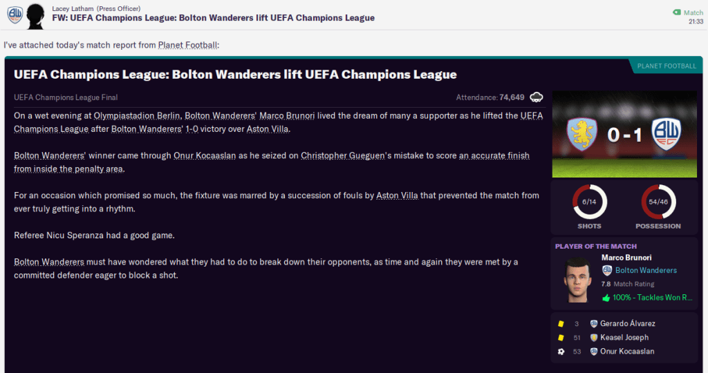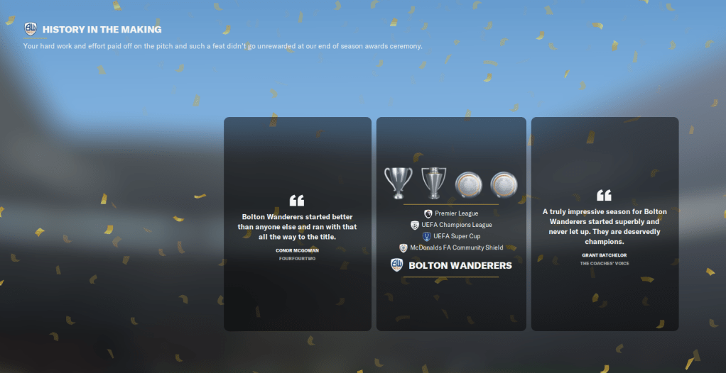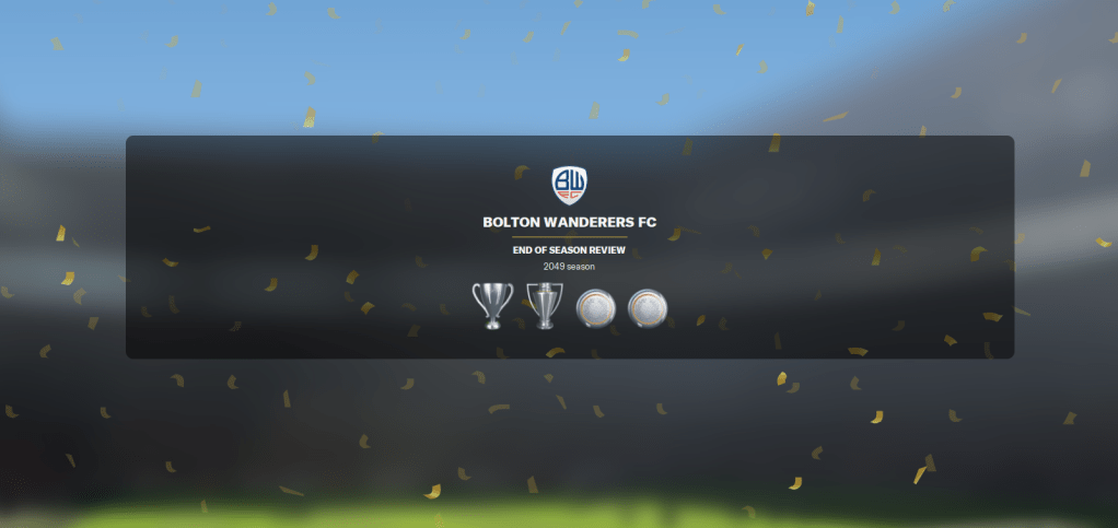 Signing off as World Champions with a 15th Premier League title and a 7th Champions League in the 175th-year of the club’s history seems like a fitting end to this crazy tale of managing a ridiculously good Bolton Wanderers side. We’ll round the season out with a Trotters Talent review and potentially look into the future with some simulations.