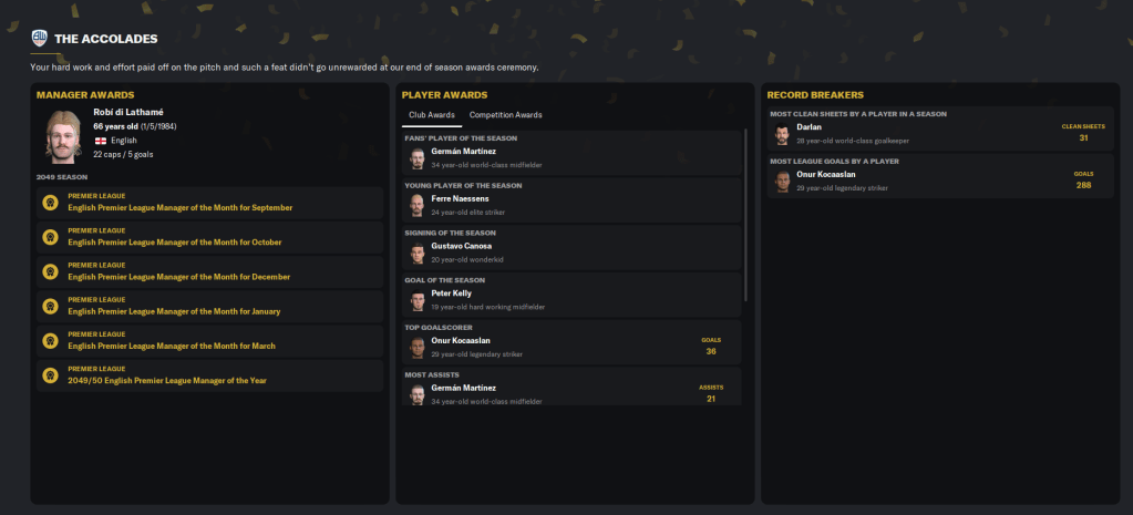 Kocaaslan was the league’s top scorer for the sixth time with 28 goals in 36 games, which was 7 more than our former striker Lotiman, now at Spurs. But Martínez was the best player in the league with 17 assists and an average rating of 7.49 in 36 games, which won him English Footballer of the Year and Players’ Player of the Year for the second time. While the exciting Bridges won English Players’ Young Player of the Year and Darlan won Golden Glove for the fifth time. And I won my 12th Manager of the Year award a couple of days after my 66th birthday.