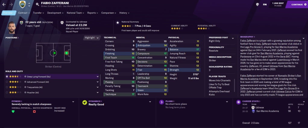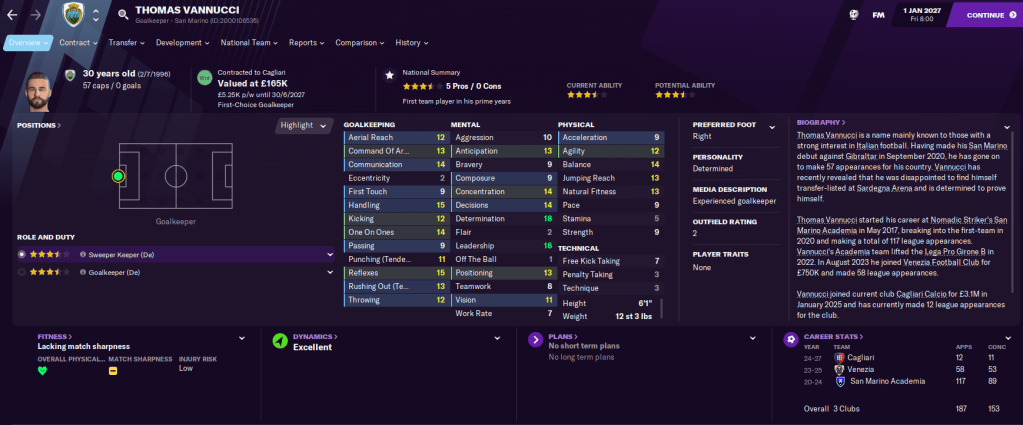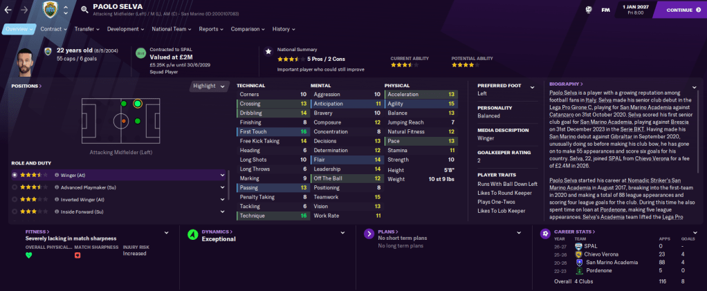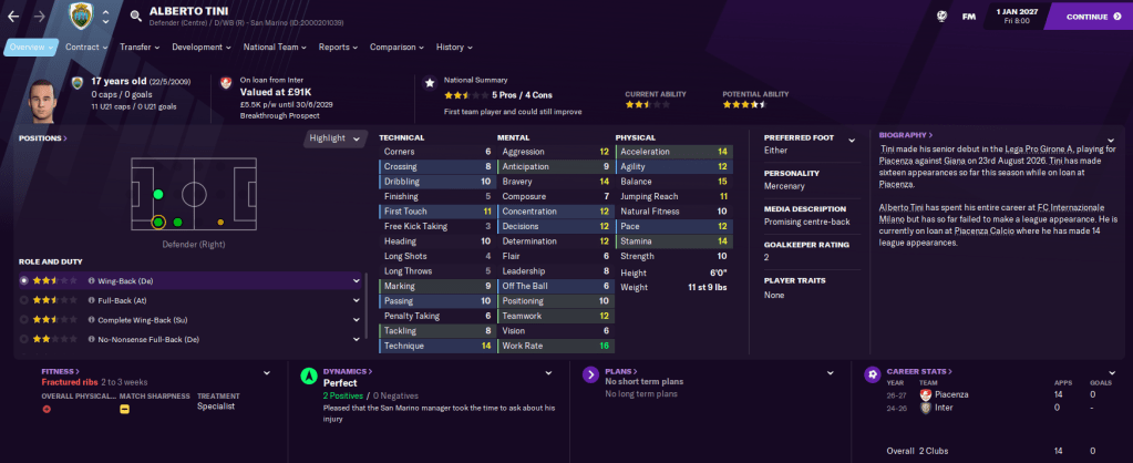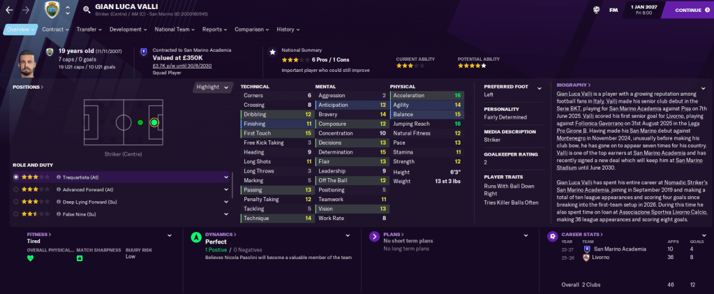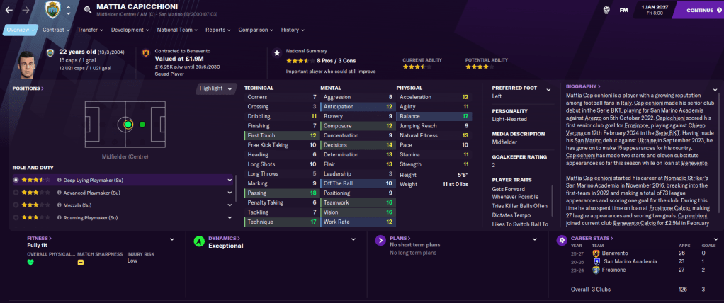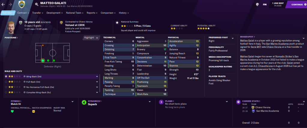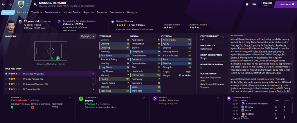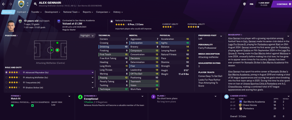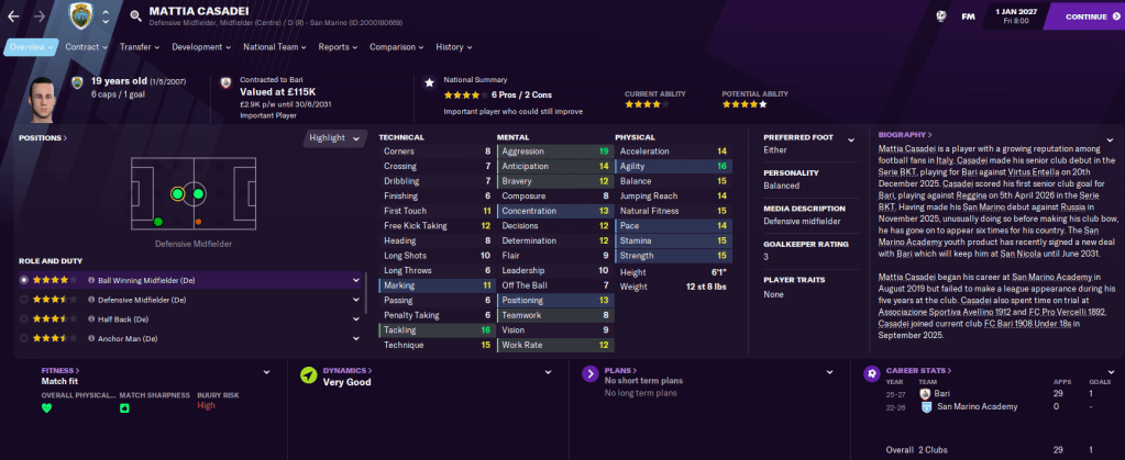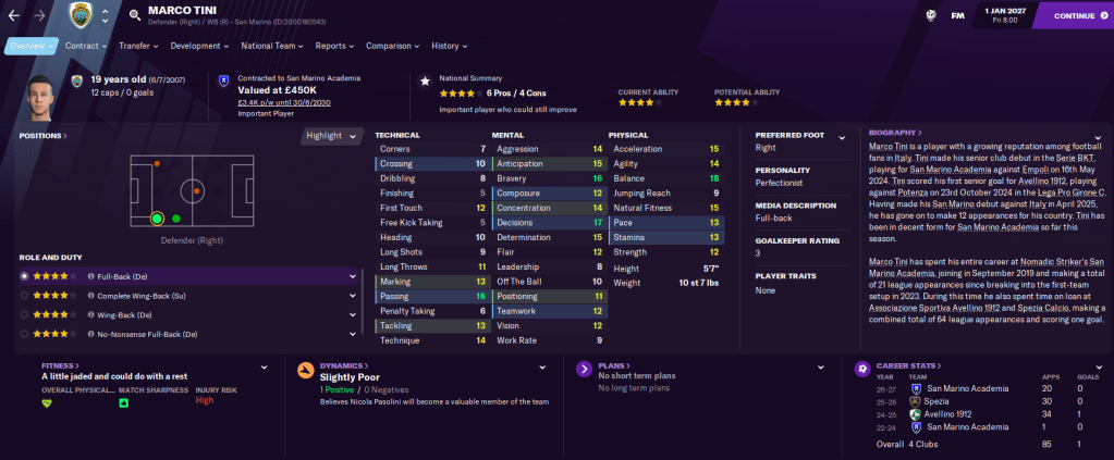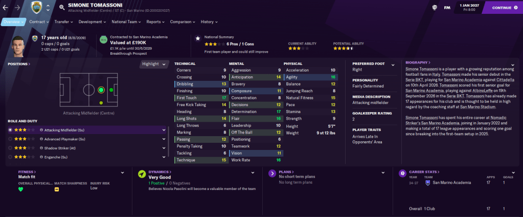 I thought early 2027 would be an opportune time to introduce some of the best players that are establishing San Marino on the international stage. Of course, the main man is striker Davide San Marino, but the highest ability players after him are holding midfielder Mattia Casadei, right-back Marco Tini and centre-back / holding midfielder Nicola Pasolini.