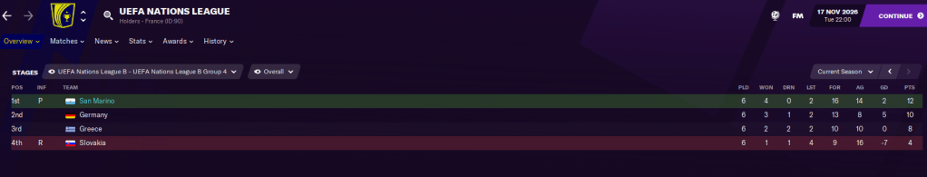 That aside, they went 10 months without a competitive game until they stepped up to the second tier of the Nations League, where they got a difficult draw with Germany, Greece and Slovakia. The group began in November 2026 with an epic game in Slovakia, who took the lead early only for DSM and a brilliant free-kick by midfielder Nicola Pasolini to put San Marino ahead. Slovakia equalised after the break but another DSM goal made it 3-2. But Slovakia came back to nick it 4-3.