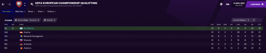Apparently, EURO qualifying is based on teams’ performances in the Nations League, which meant San Marino were amongst the second seeds. That landed them a relatively favourable draw alongside Austria, Bosnia, Slovenia, Armenia and Andorra.