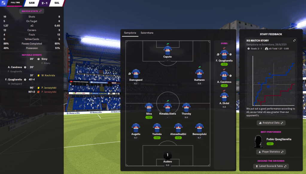 A first home game saw Salernitana come to town and take the lead with their only attack of the first half as Simy converted a Franck Ribéry cross. But the hosts well and truly bossed the match and turned things around as Candreva finished off a superb team move then Quagliarella tucked home a Damsgaard cross. There was plenty to enjoy about the performance, but only 1.27 xG from 16 shots was a slight concern.
