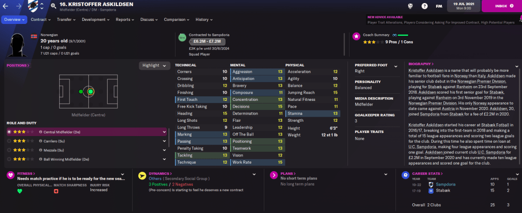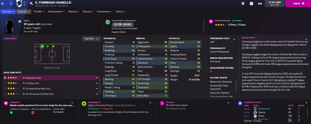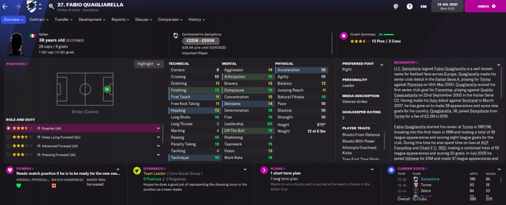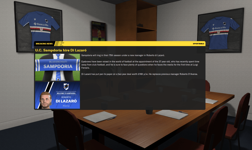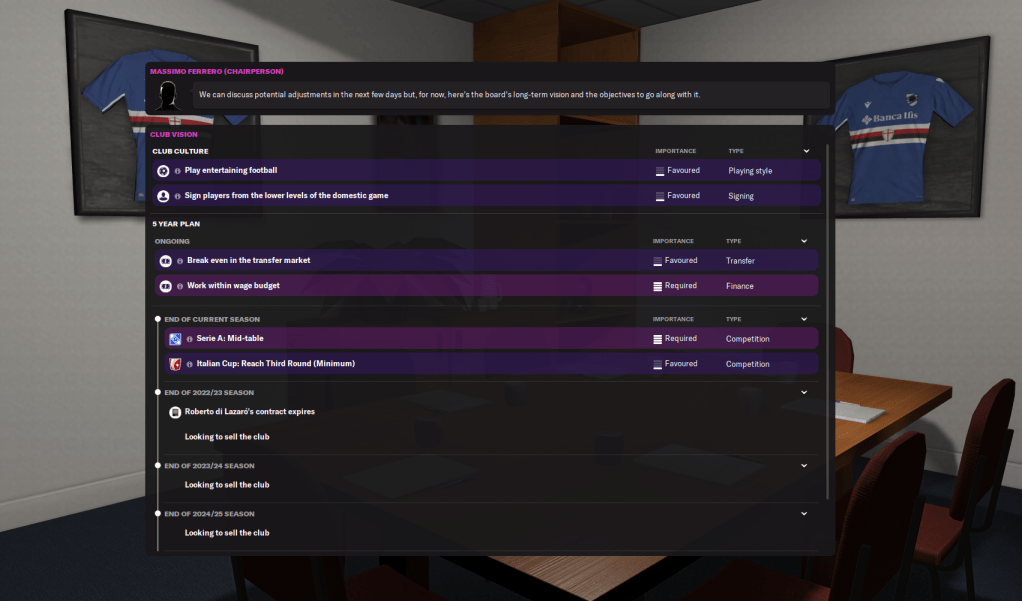 FM22 sees a new character join the FMA roster as Roberto di Lazaró took the reins as Sampdoria manager as the club celebrates its 75th season. di Lazaró’s new board expects the manager to play entertaining gootball and sign players from the lower reaches of the Italian league system. It wants a mid-table finish and, slightly worryingly, the club’s owner is actively looking to sell the club in the next two years.