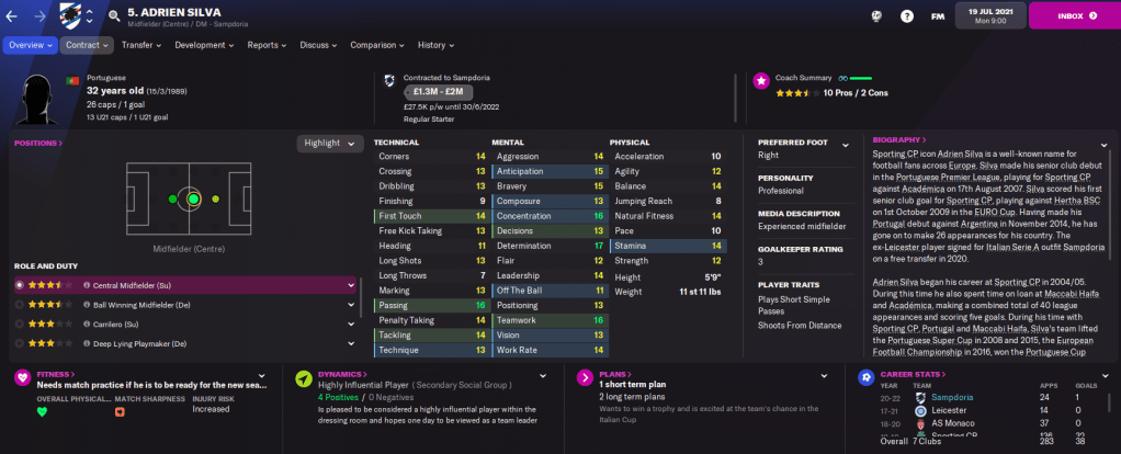 The best players at Sampdoria ability-wise are 33-year-old striker Francesco Caputo, who’s on loan from Sassuolo and joins permanently at the end of the season, and 34-year-old winger Antonio Candreva. They’re closely followed by midfielders Adrien Silva, who’s a personal favourite player from an old Sporting save, Morten Thorsby and Albin Ekdal, left-back Tommaso Augello and legendary 38-year-old striker Quagliarella.
