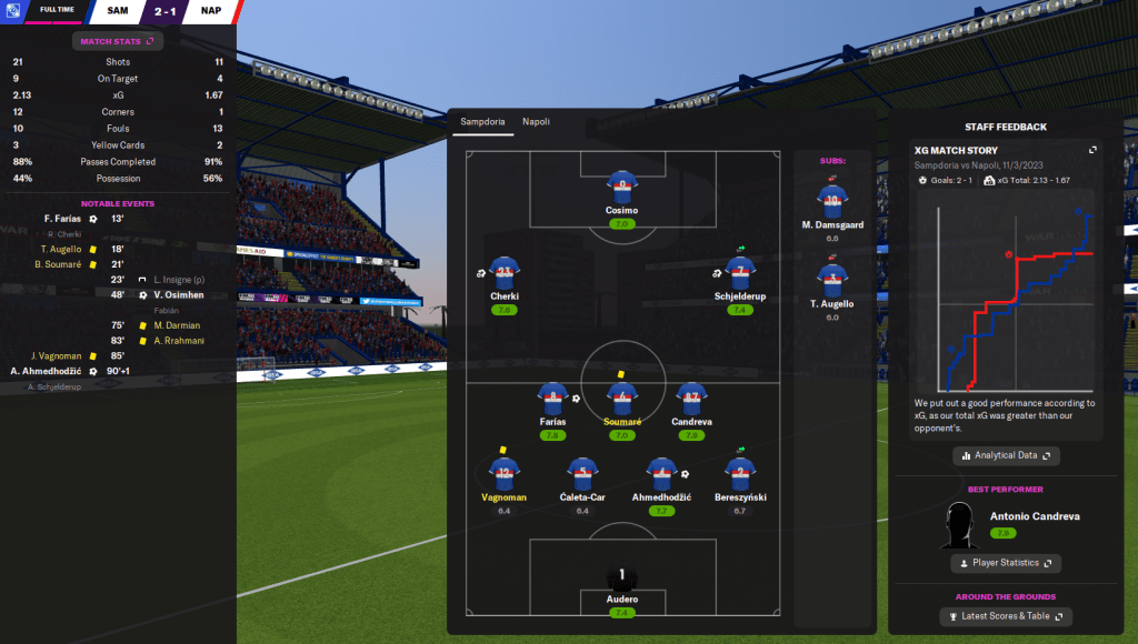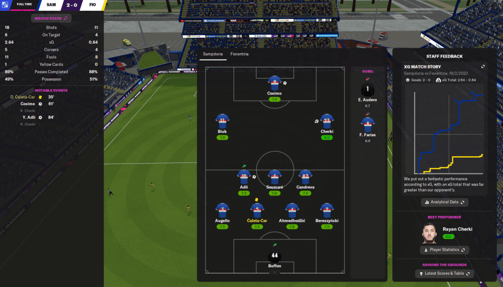 The fixture list eased up a little but Samp were again wasteful as they beat Torino 1-0 despite 2.42 xG. But they kicked into gear to thump Empoli 3-1, as Candreva scored and created one for Cherki then Damsgaard rounded off a brilliant team move before the break, to tie the club record points total. And they smashed it as Damsgaard created both Cosimo goals to beat Monza 2-1 and move onto 70 points.