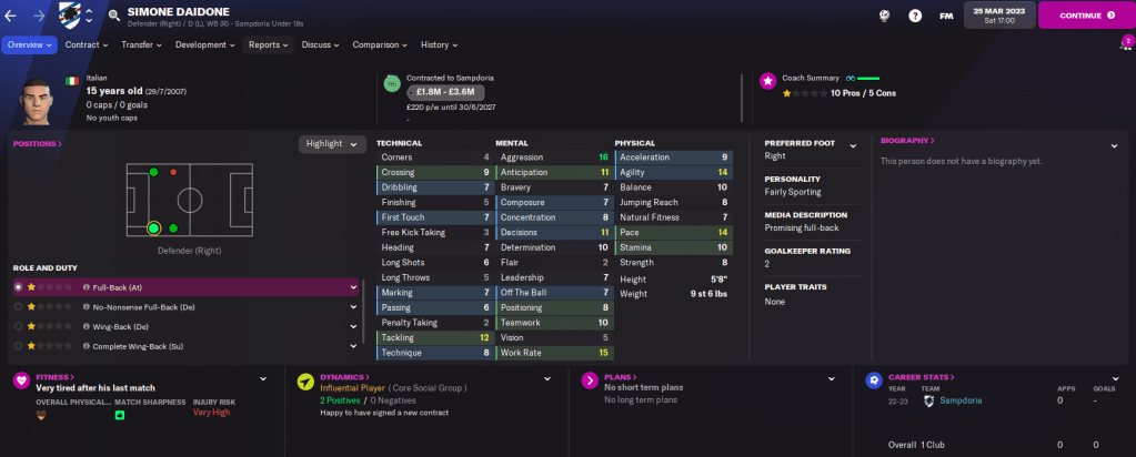 Four Samp players – Schjeldrup (5th), Siri (36th), Giorgio Scalvini (41st) and Cherki (43rd) – made the NxGN 2023 list, which was won by Jude Bellingham and shows the promise in this young squad. And there’s plenty more to come as Samp won the Under 20 Cup and the Primavera 1 league title inspired by exciting winger Valentin Decarpentrie. While this year’s youth intake was led by exciting right-back Simone Daidone, who has 5-star potential (not sure why that’s no longer displayed on their main profile) and is already the fourth-best right-back at the club. There were also 3.5-star potential youngsters.
