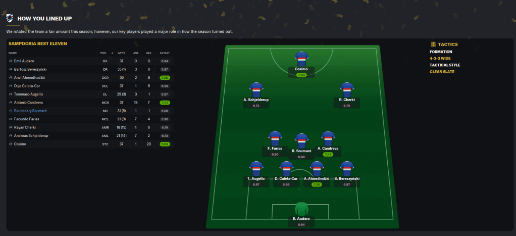 Samp’s main man this season was 36-year-old Candreva, who defied his age with seven goals and 18 assists at an average rating of 7.41 in 37 games. He has been phenomenal this season! Another key man has been centre-back Anel Ahmedhodzic, who scored eight goals and averaged 7.38, which has attracted the interest of Real Madrid, Man City and many more.