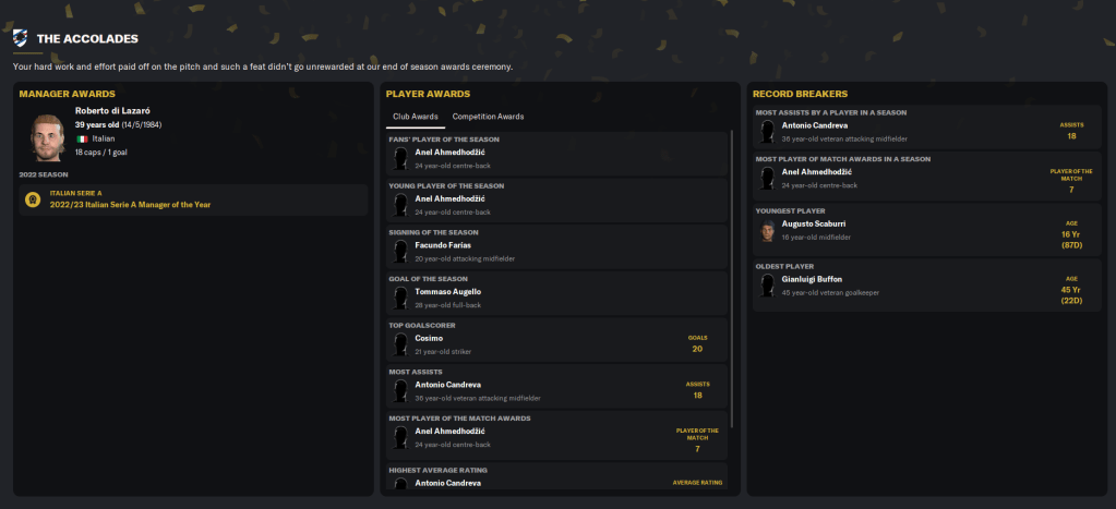 The evergreen Candreva got the most assists in Serie A with 18, three clear of Roma’s Veretout. But mention has to go to Immobile, who broke the Serie A goalscoring record with 43 goals in 37 games – more than double the next top goalscorer, Sassuolo’s Raspadori on 21. And the team’s overachievement saw di Lazaró win Serie A Manager of the Year!