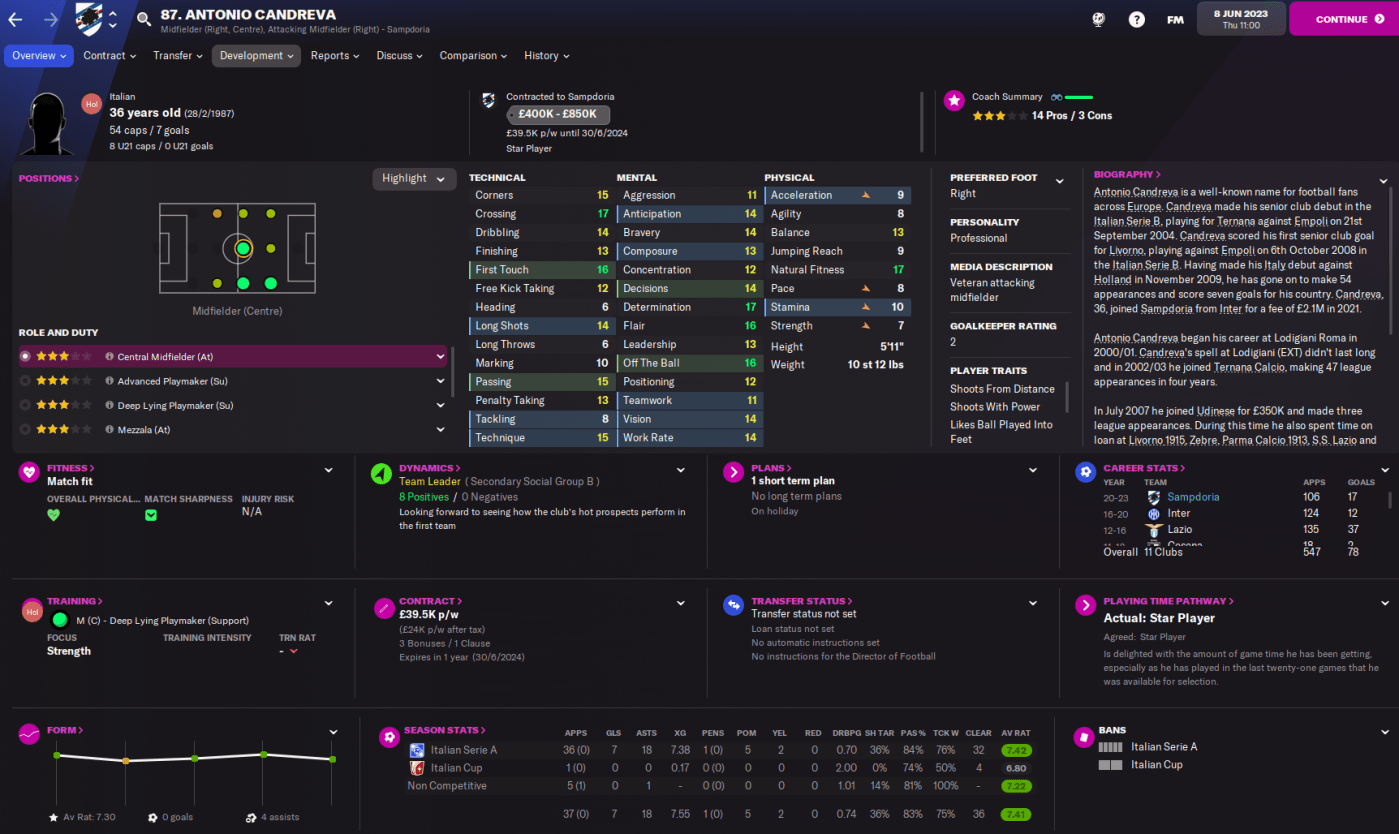 Four Samp players – Schjeldrup (5th), Siri (36th), Giorgio Scalvini (41st) and Cherki (43rd) – made the NxGN 2023 list, which was won by Jude Bellingham and shows the promise in this young squad. And there’s plenty more to come as Samp won the Under 20 Cup and the Primavera 1 league title inspired by exciting winger Valentin Decarpentrie. While this year’s youth intake was led by exciting right-back Simone Daidone, who has 5-star potential (not sure why that’s no longer displayed on their main profile) and is already the fourth-best right-back at the club. There were also 3.5-star potential youngsters.