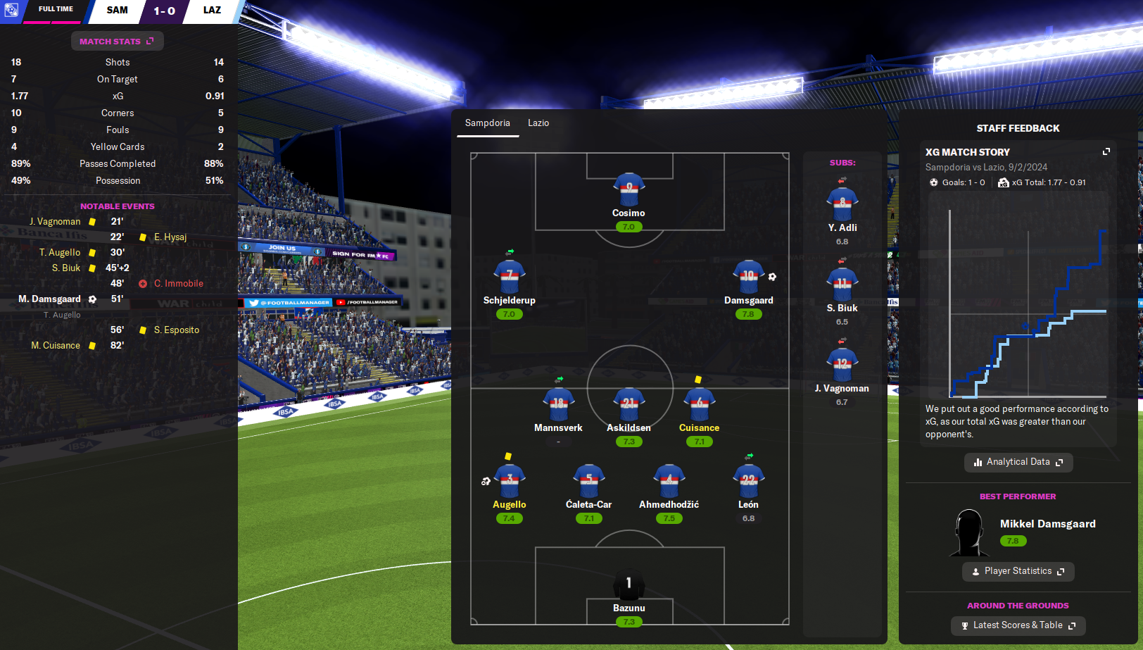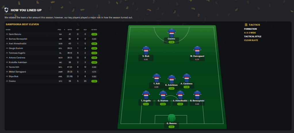 Samp confirmed second place with a pretty dire 1-0 win at bottom side Spezia, in which Candrvea was player of the match in his last-ever away game. They finished the season at home to Monza and the woefully out-of-form Damsgaard opened the scoring but another wasteful performance saw them draw 1-1.
