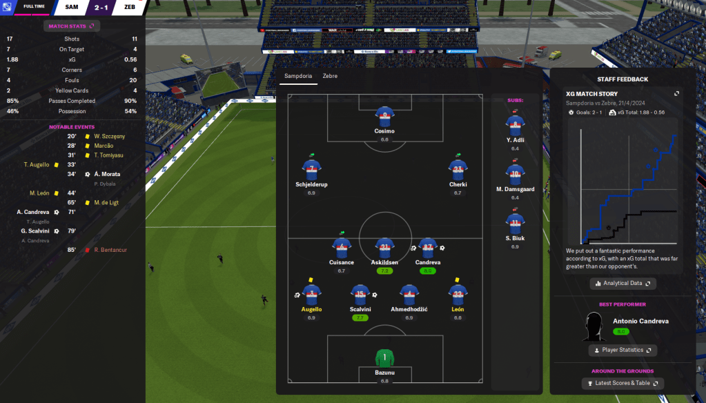 A week later, Samp travelled to closest rivals Milan. They performed well defensively until three late goals from crosses (shocker) saw Milan go 2-0 up before Cosimo got one back. And Milan moved top of the league. They then welcomed Juve to town and went behind to a Morata header completely against the run of play. But an inspired second-half performance with a goal and assists from the soon-to-be retiring Candreva earned them a much-deserved win.